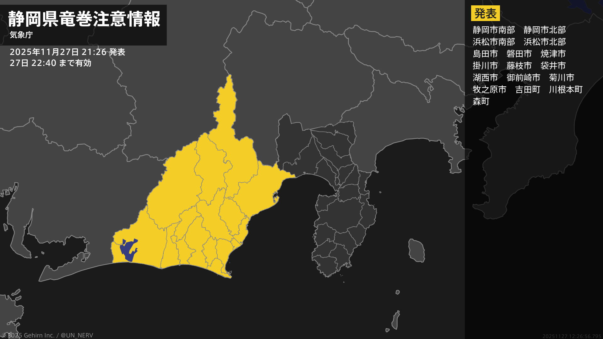 静岡県は、竜巻などの激しい突風が発生しやすい気象状況になっています。頑丈な建物内に移動するなど安全確保に努めてください。この情報は27日22:40まで有効です。