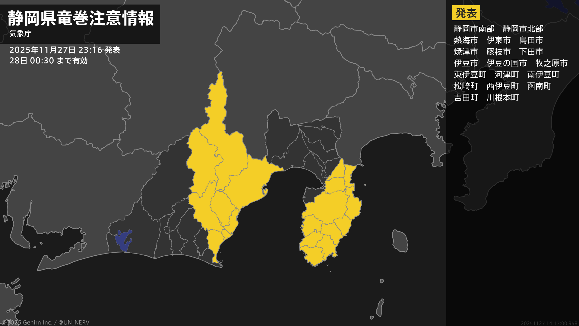 【静岡県 竜巻注意情報】静岡県は、竜巻などの激しい突風が発生しやすい気象状況になっています。頑丈な建物内に移動するなど安全確保に努めてください。この情報は28日00:30まで有効です。#竜巻注意情報 #静岡県