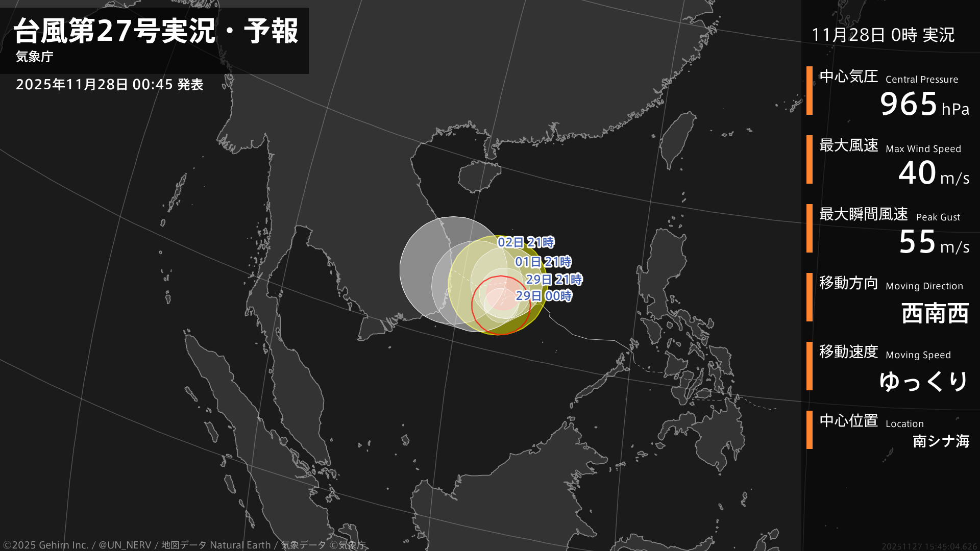 【台風第27号実況・予報 2025年11月28日 00:45】強い台風第27号(コト)は、南シナ海をゆっくりと西南西に進んでいます。#台風情報