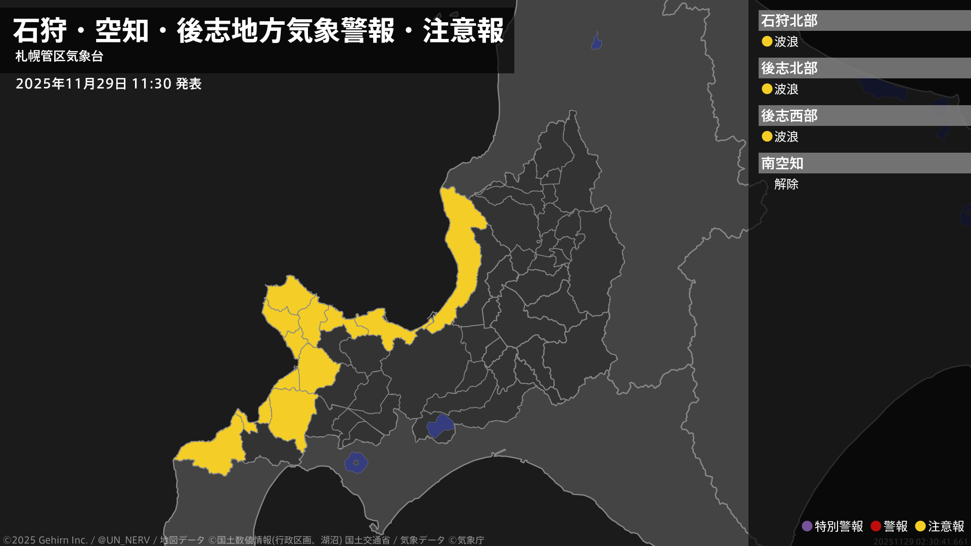 【石狩・空知・後志地方 気象警報・注意報 2025年11月29日 11:30】石狩、後志地方では、29日夕方まで高波に注意してください。#気象警報注意報 #石狩地方 #空知地方 #後志地方