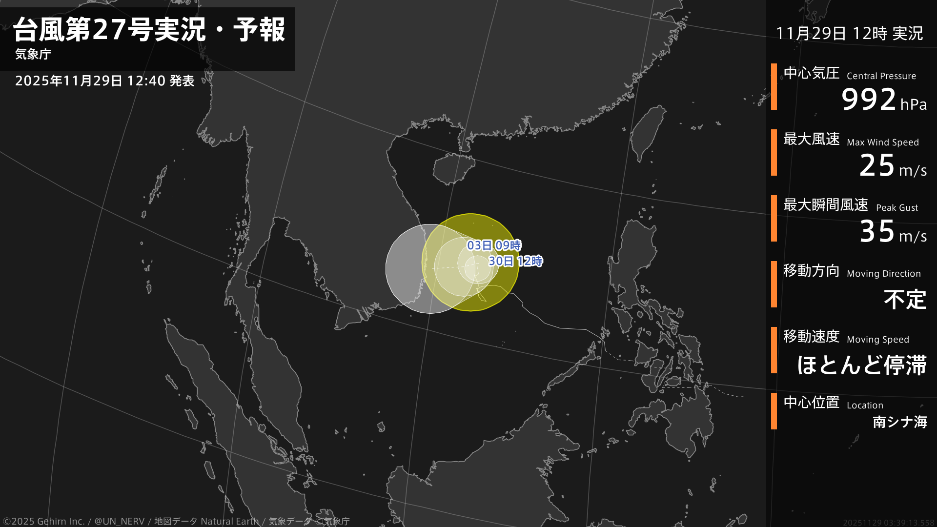 【台風第27号実況・予報 2025年11月29日 12:39】台風第27号(コト)は、南シナ海でほとんど停滞しています。#台風情報