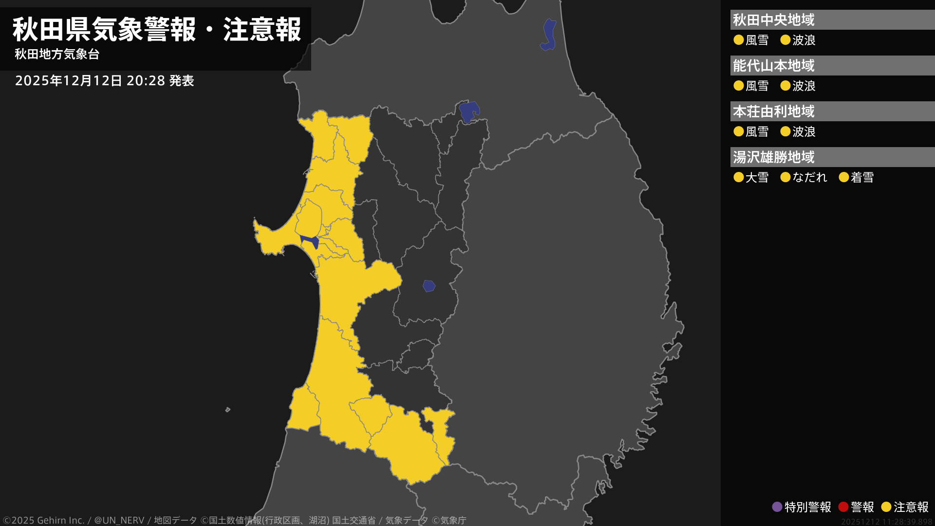 【秋田県 気象警報・注意報 2025年12月12日 20:28】沿岸では、12日夜遅くまで風雪に、13日昼前まで高波に注意してください。内陸では、13日明け方まで大雪や電線等への着雪に、13日までなだれに注意してください。#気象警報注意報 #秋田県
