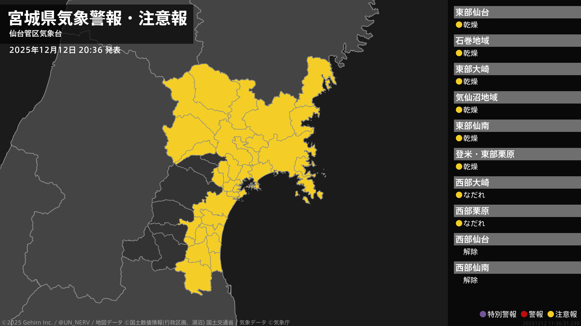 【宮城県 気象警報・注意報 2025年12月12日 20:36】東部では、13日まで空気の乾燥した状態が続くため、火の取り扱いに注意してください。西部では、13日までなだれに注意してください。#気象警報注意報 #宮城県