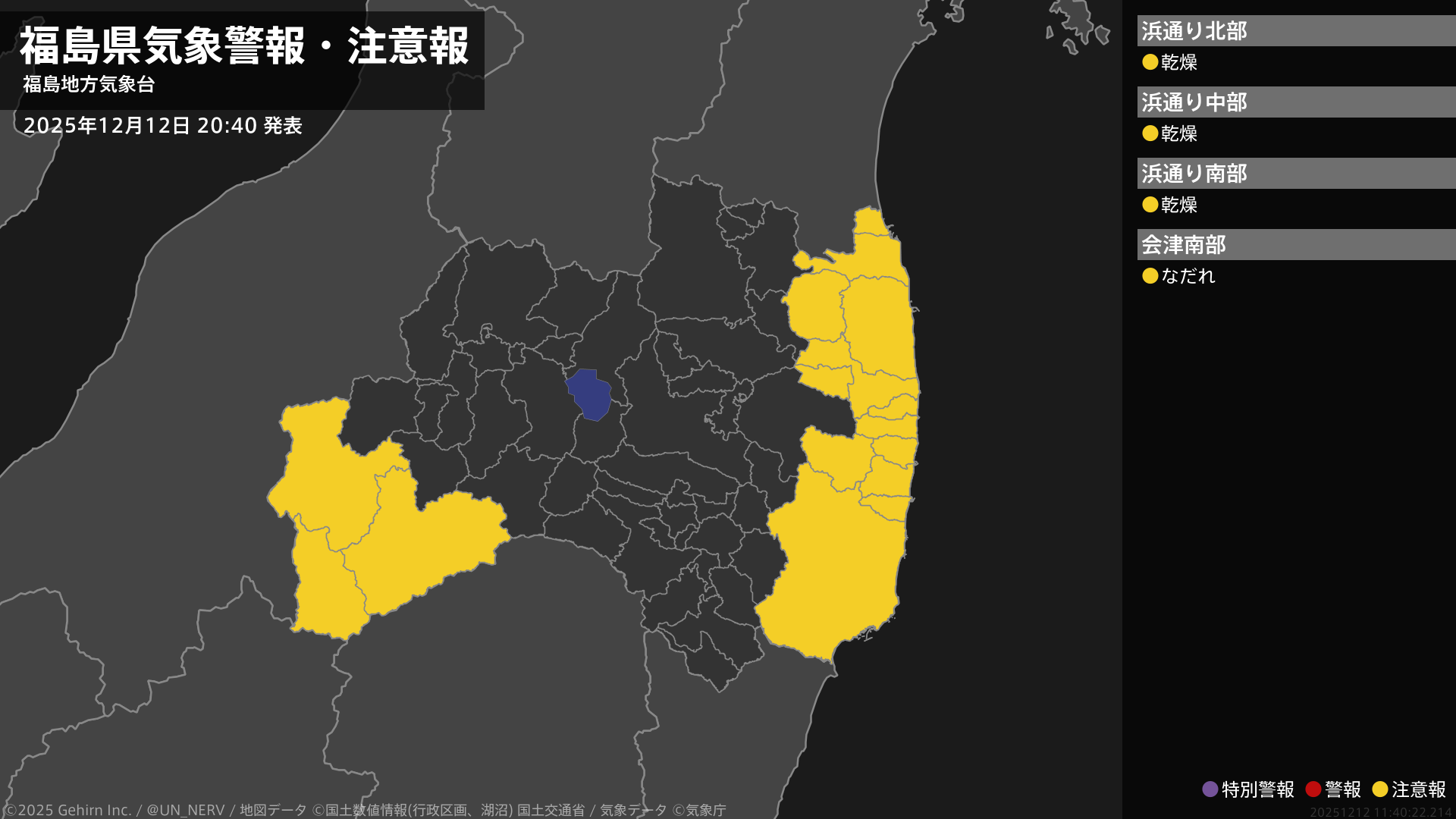 【福島県 気象警報・注意報 2025年12月12日 20:40】浜通りでは、13日まで空気の乾燥した状態が続くため、火の取り扱いに注意してください。会津では、13日までなだれに注意してください。#気象警報注意報 #福島県