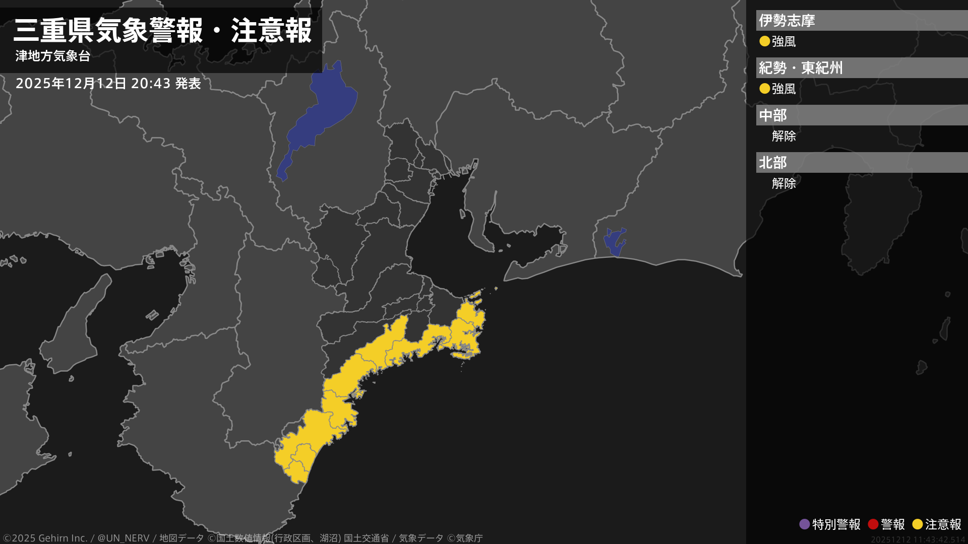 【三重県 気象警報・注意報 2025年12月12日 20:43】南部では、13日明け方まで強風に注意してください。#気象警報注意報 #三重県