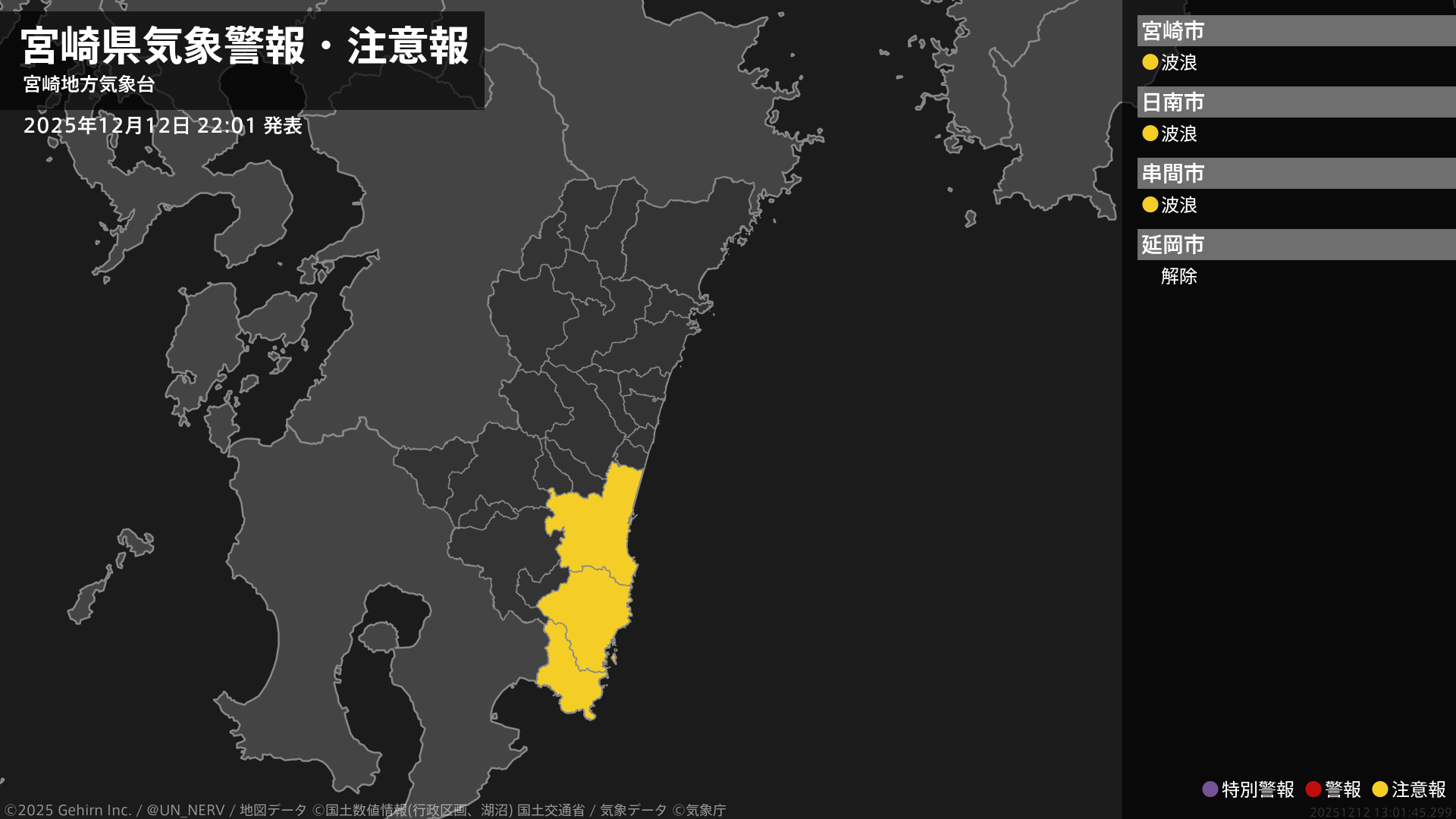 【宮崎県 気象警報・注意報 2025年12月12日 22:01】南部平野部では、13日未明から13日朝まで高波に注意してください。#気象警報注意報 #宮崎県