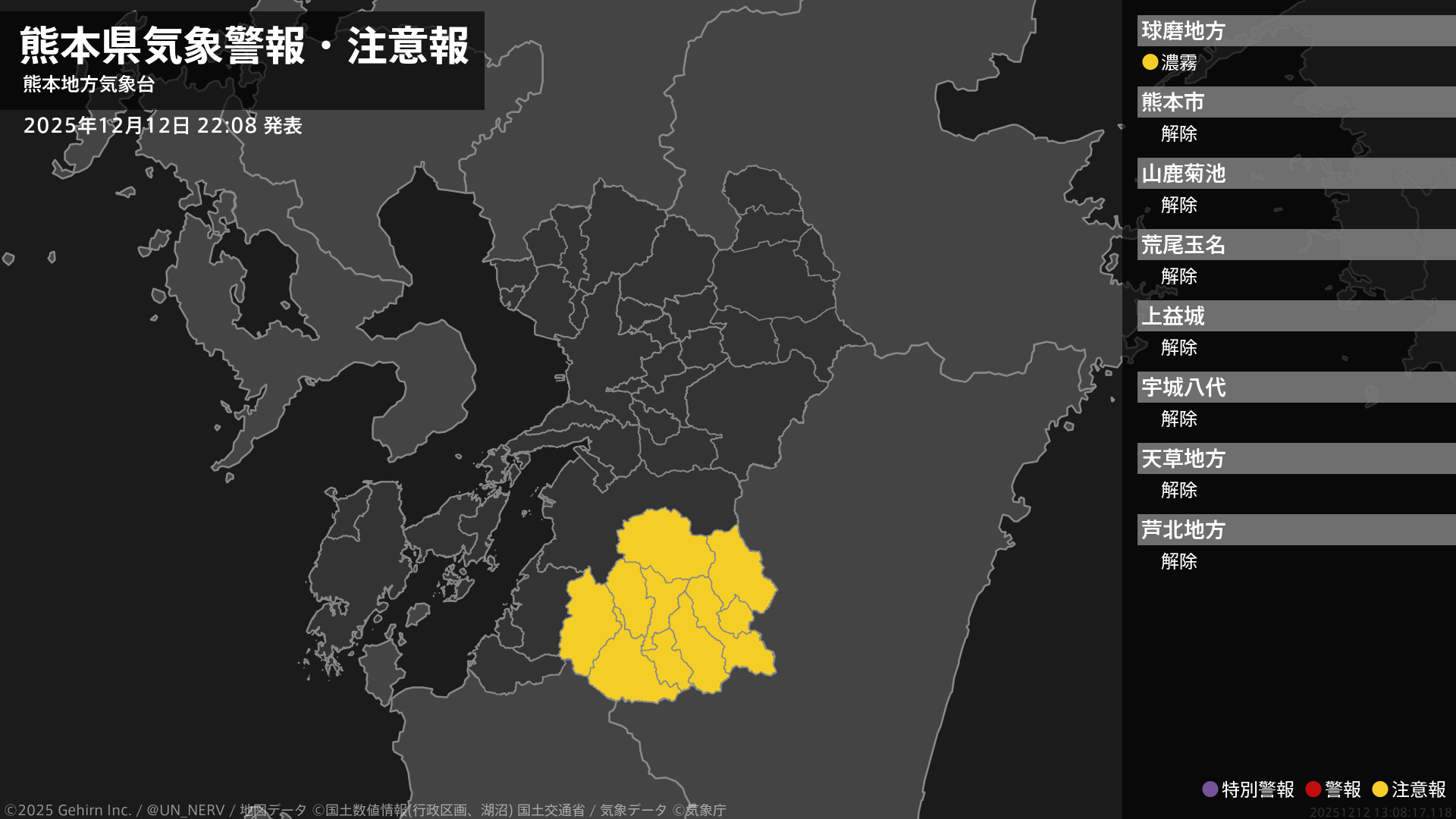 【熊本県 気象警報・注意報 2025年12月12日 22:08】球磨地方では、13日明け方から13日昼前まで濃霧による視程障害に注意してください。#気象警報注意報 #熊本県