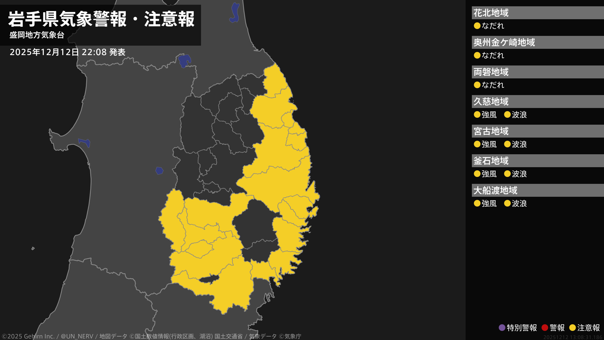【岩手県 気象警報・注意報 2025年12月12日 22:08】沿岸北部、沿岸南部では、13日明け方まで強風や高波に注意してください。内陸では、13日までなだれに注意してください。#気象警報注意報 #岩手県