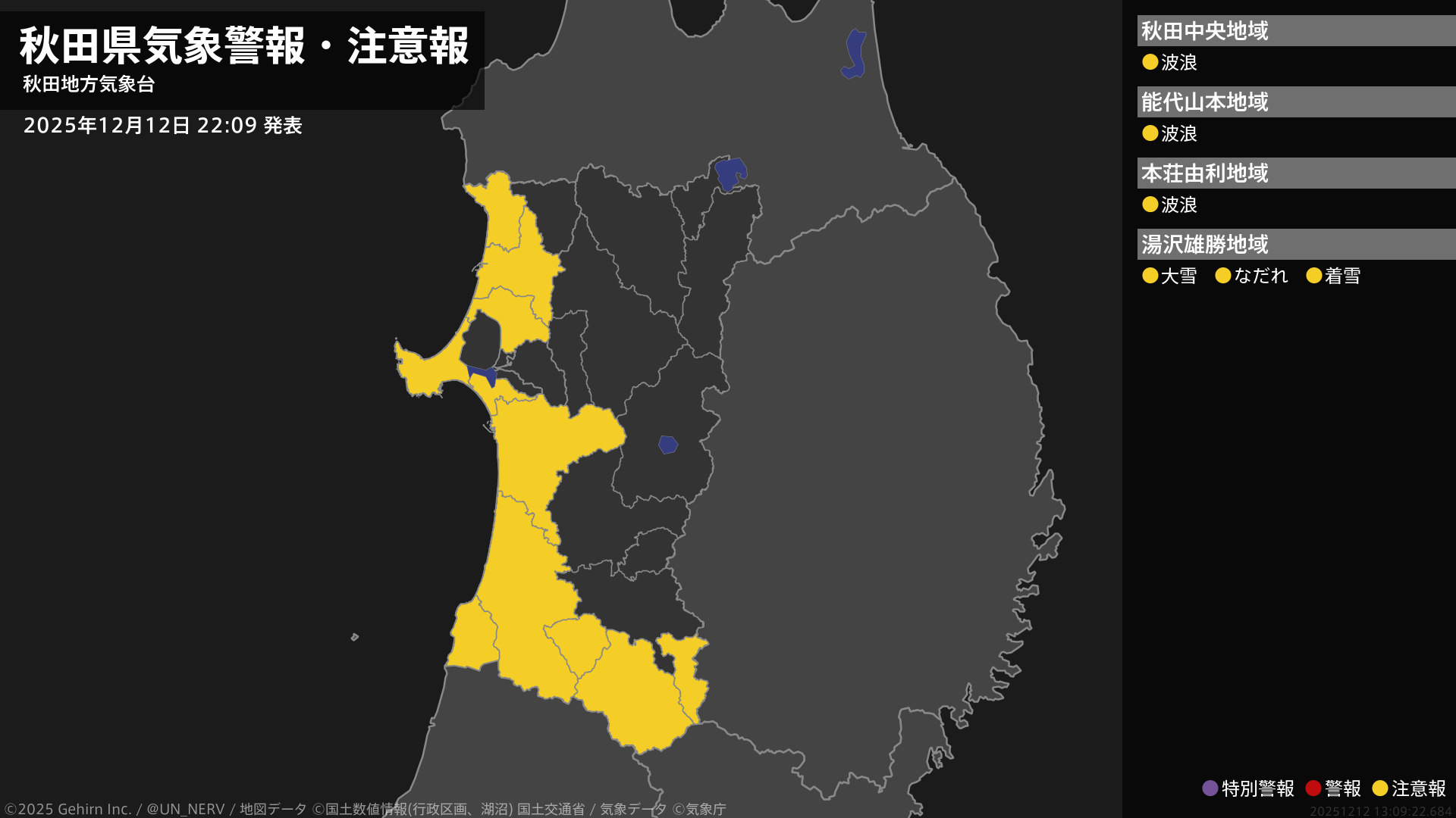 【秋田県 気象警報・注意報 2025年12月12日 22:09】内陸では、13日明け方まで大雪や電線等への着雪に、13日までなだれに注意してください。沿岸では、13日昼前まで高波に注意してください。#気象警報注意報 #秋田県