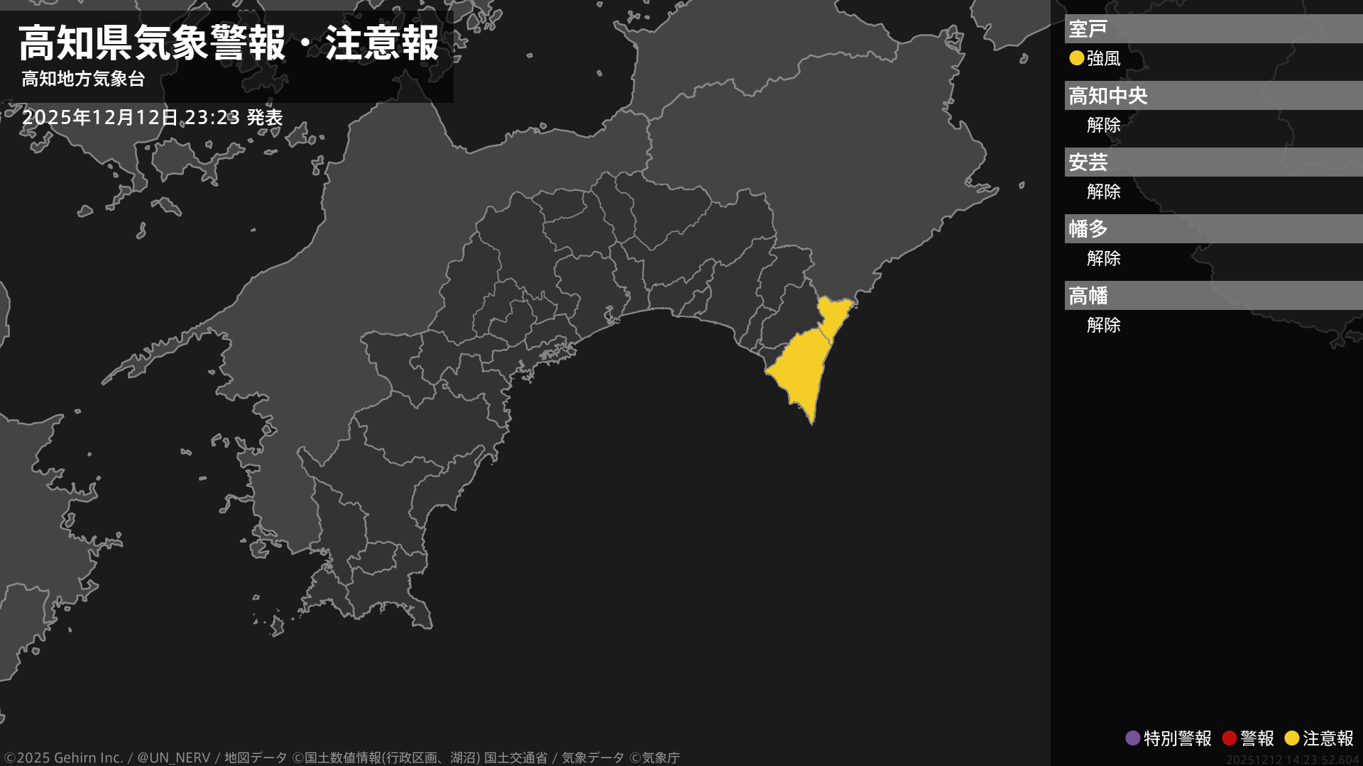 【高知県 気象警報・注意報 2025年12月12日 23:23】東部では、13日明け方まで強風に注意してください。#気象警報注意報 #高知県