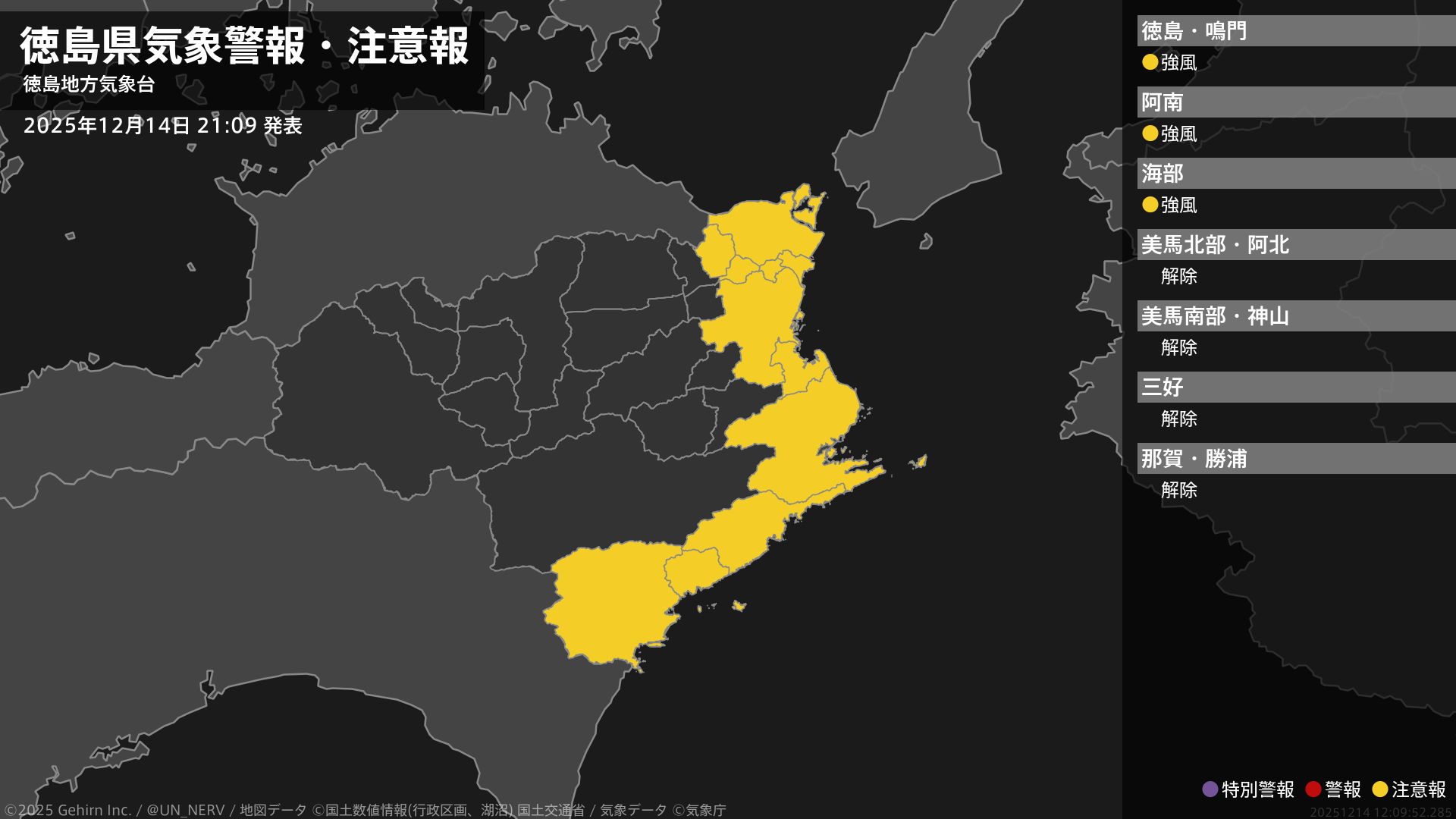 【徳島県 気象警報・注意報 2025年12月14日 21:09】徳島県では、15日昼前まで強風に注意してください。#気象警報注意報 #徳島県