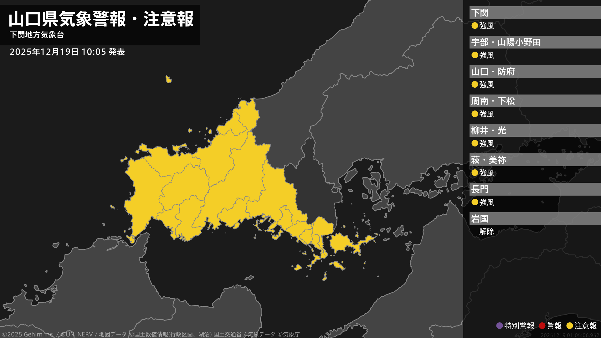 【山口県 気象警報・注意報 2025年12月19日 10:05】