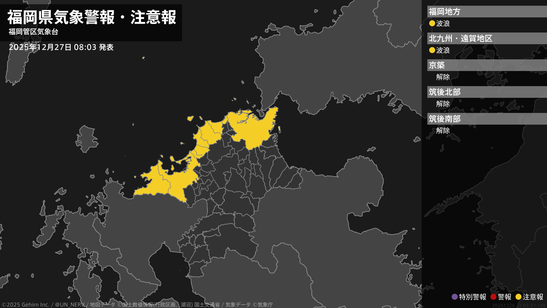 【福岡県 気象警報・注意報 2025年12月27日 08:03】福岡、北九州地方では、27日昼前まで高波に注意してください。#気象警報注意報 #福岡県