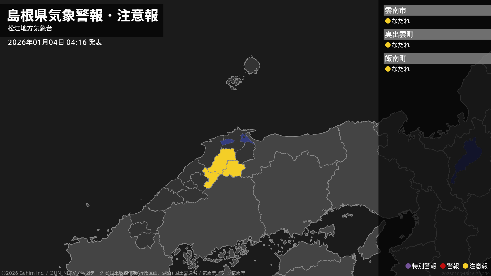 【島根県 気象警報・注意報 2026年01月04日 04:16】東部では、4日までなだれに注意してください。#気象警報注意報 #島根県