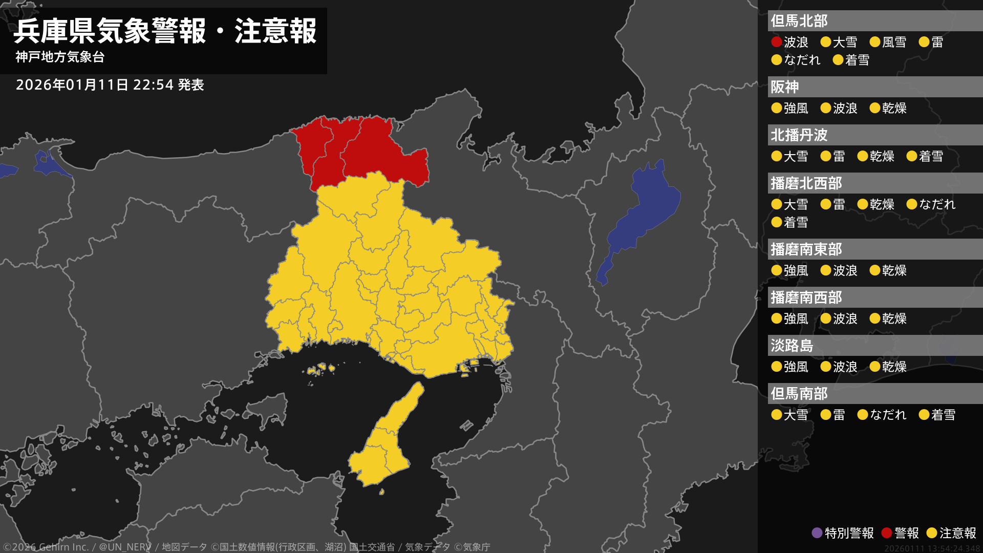【兵庫県 気象警報・注意報 2026年01月11日 22:54】北部では、12日明け方まで高波に警戒してください。#気象警報注意報 #兵庫県