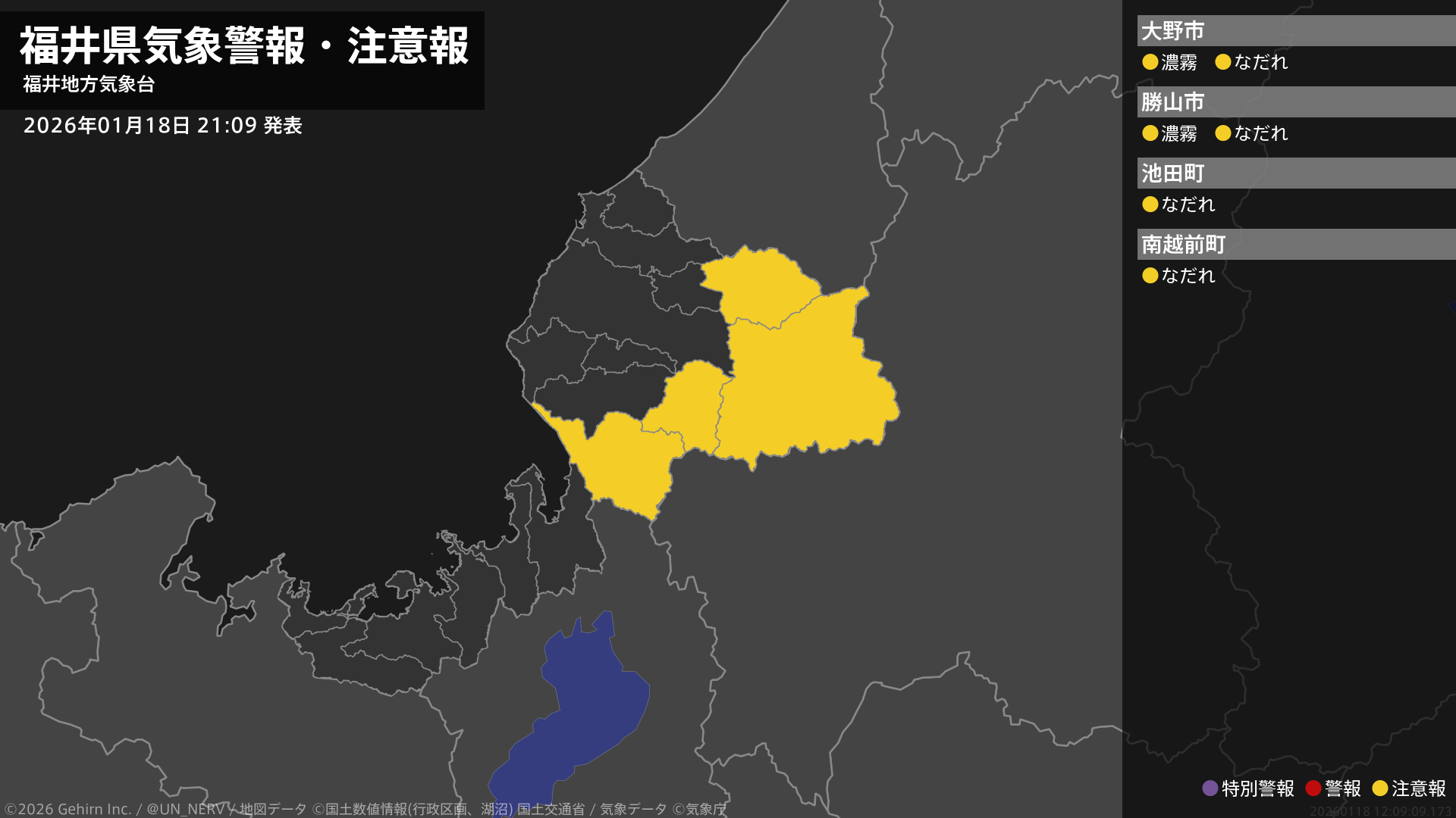 【福井県 気象警報・注意報 2026年01月18日 21:09】嶺北では、19日未明から19日昼前まで濃霧による視程障害に、19日までなだれに注意してください。#気象警報注意報 #福井県