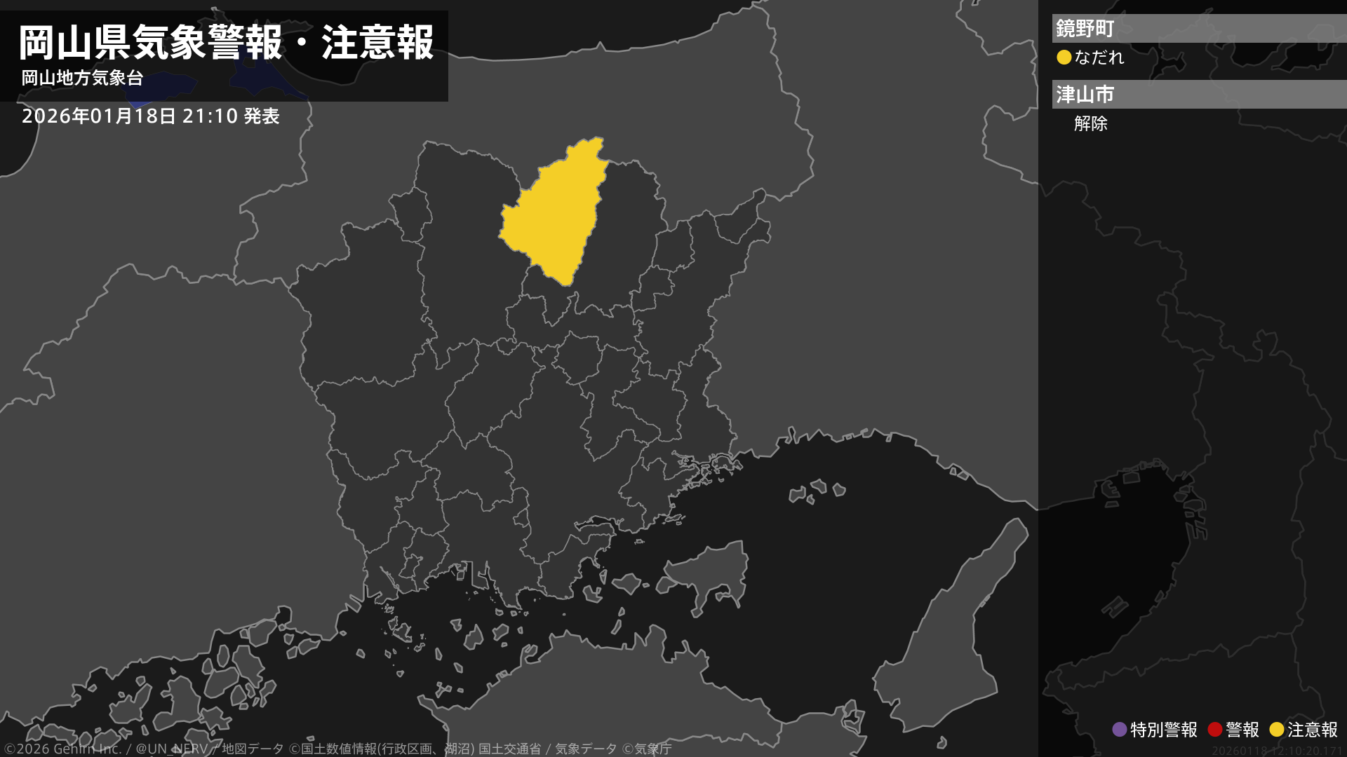 【岡山県 気象警報・注意報 2026年01月18日 21:10】北部では、19日までなだれに注意してください。#気象警報注意報 #岡山県