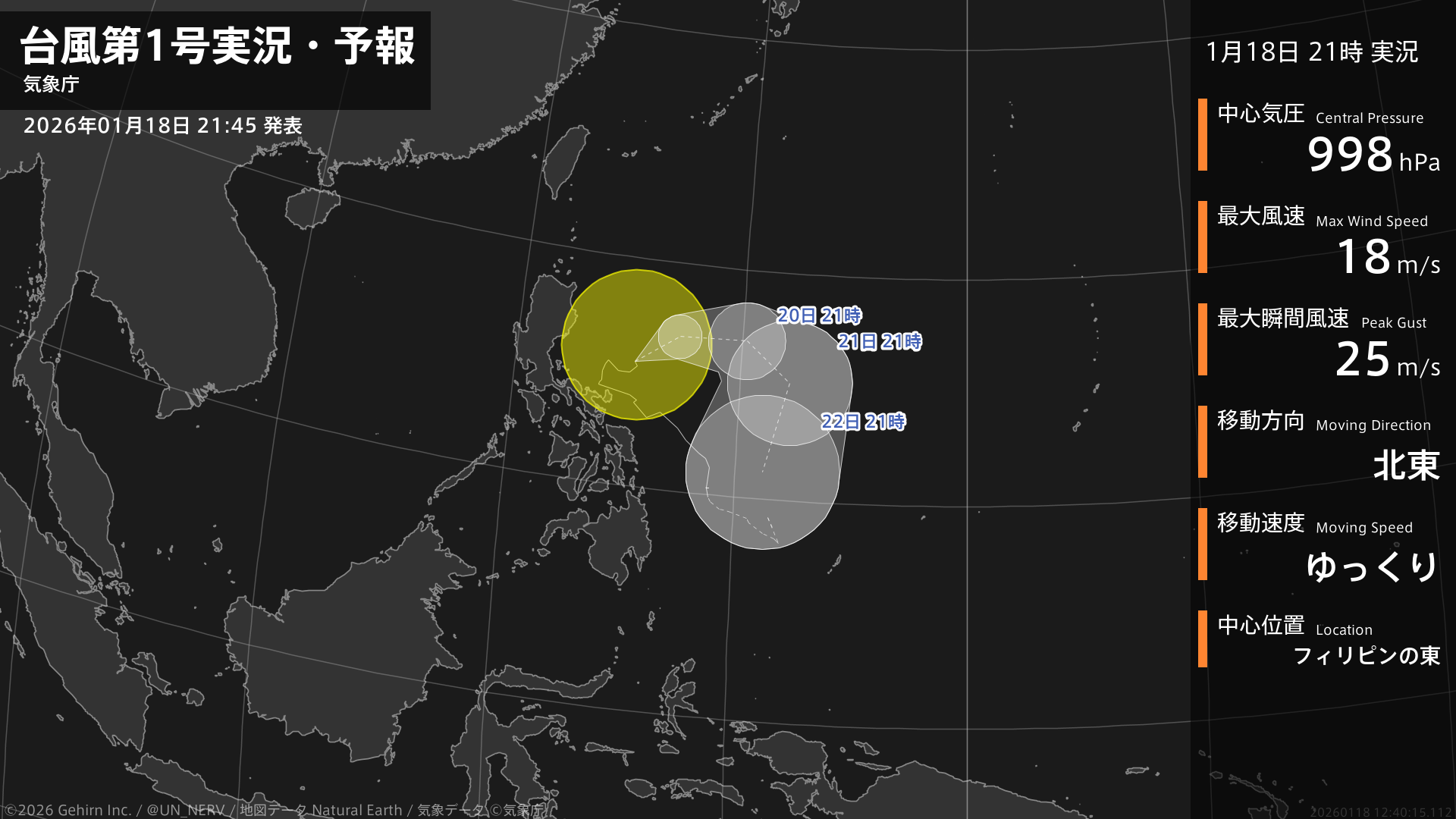 【台風第1号実況・予報 2026年01月18日 21:40】台風第1号(ノケーン)は、フィリピンの東をゆっくりと北東に進んでいます。#台風情報