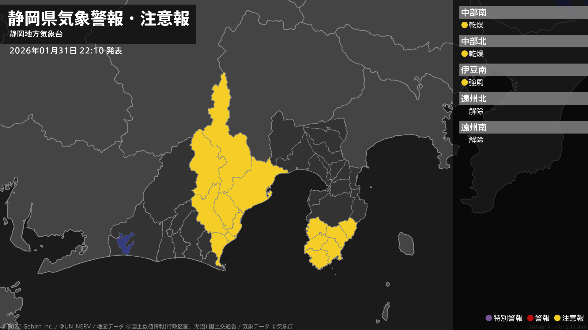 【静岡県 気象警報・注意報 2026年01月31日 22:10】伊豆では、1日明け方から強風に注意してください。中部では、2日まで空気の乾燥した状態が続くため、火の取り扱いに注意してください。#気象警報注意報 #静岡県