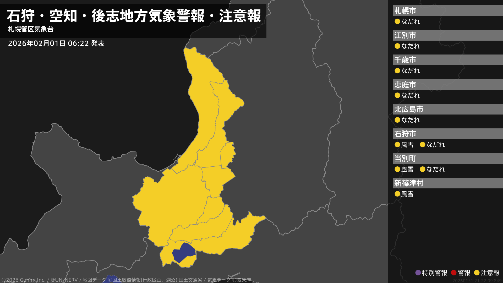 【石狩・空知・後志地方 気象警報・注意報 2026年02月01日 06:22】