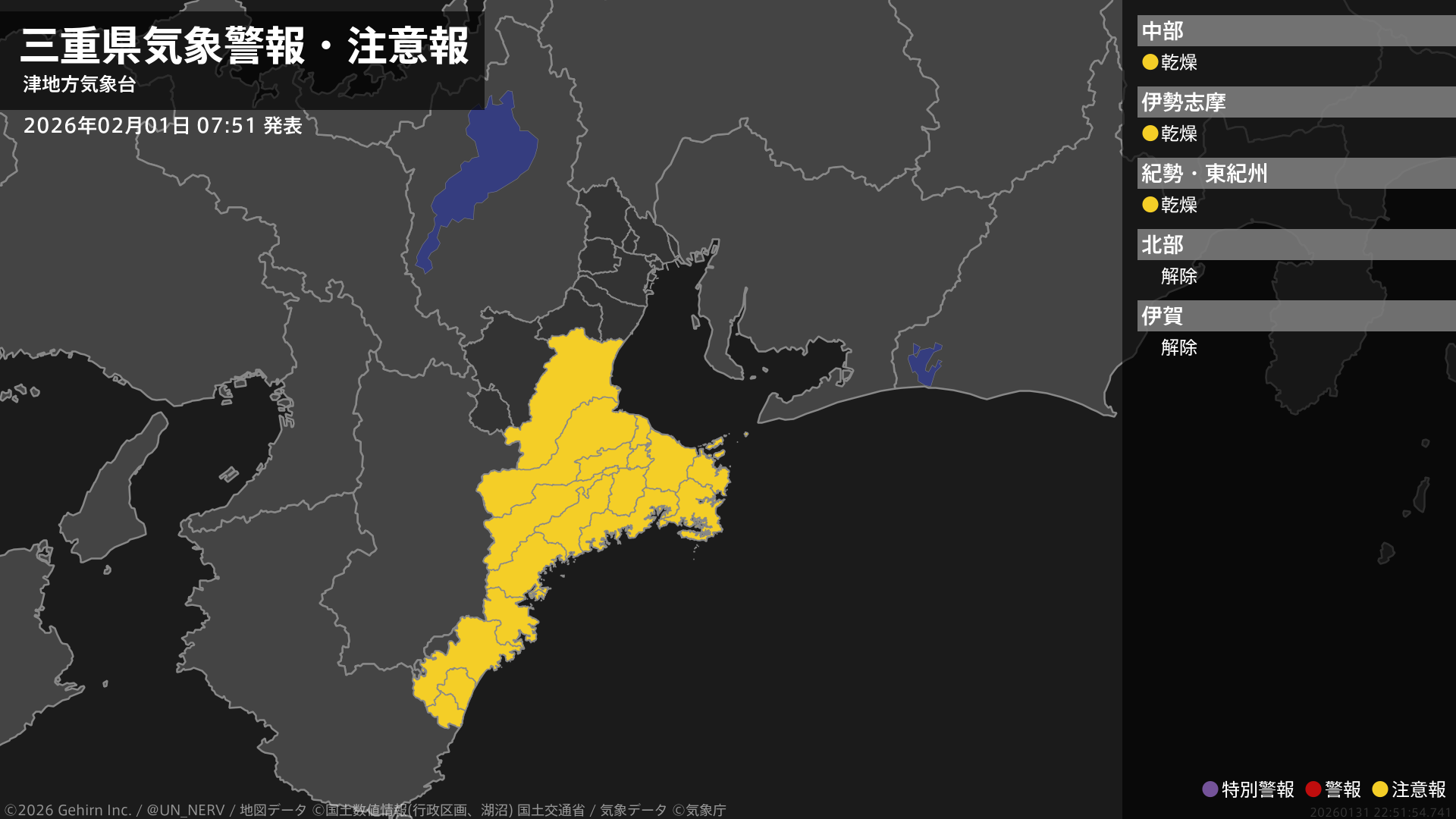 【三重県 気象警報・注意報 2026年02月01日 07:51】