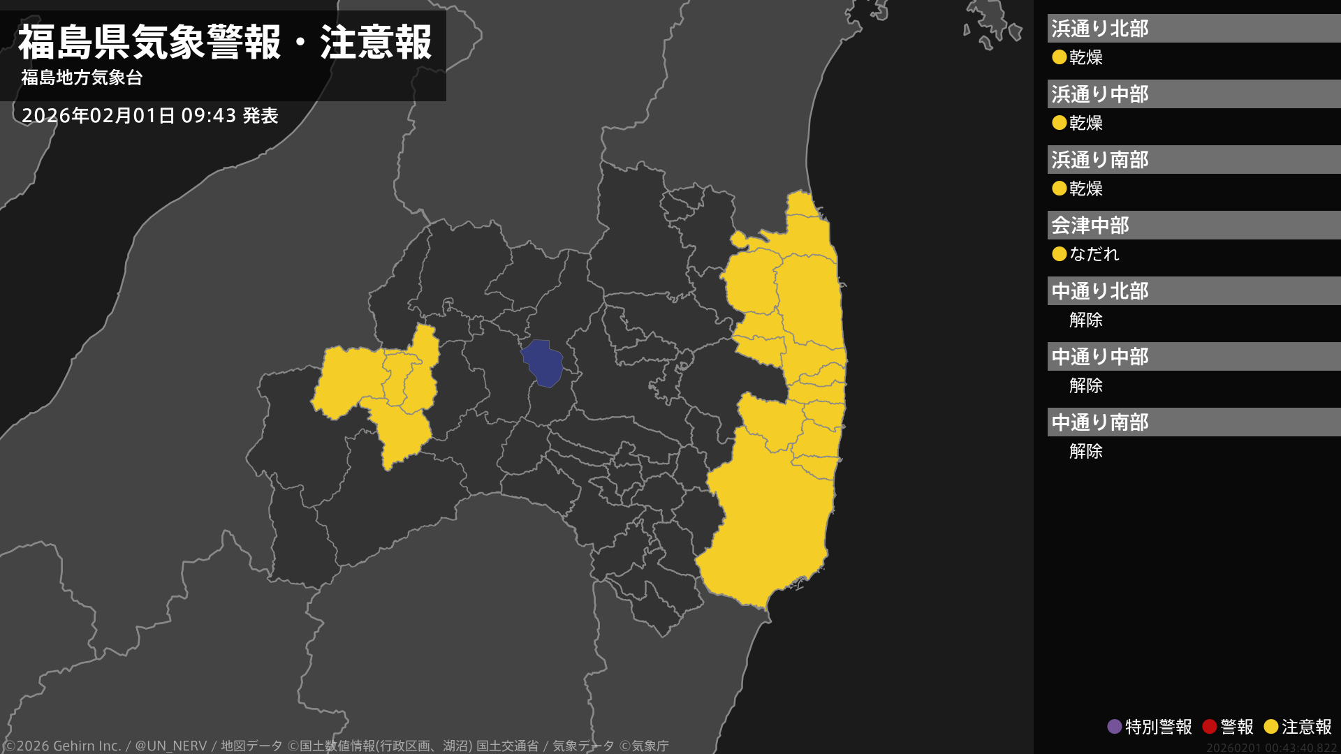 【福島県 気象警報・注意報 2026年02月01日 09:43】