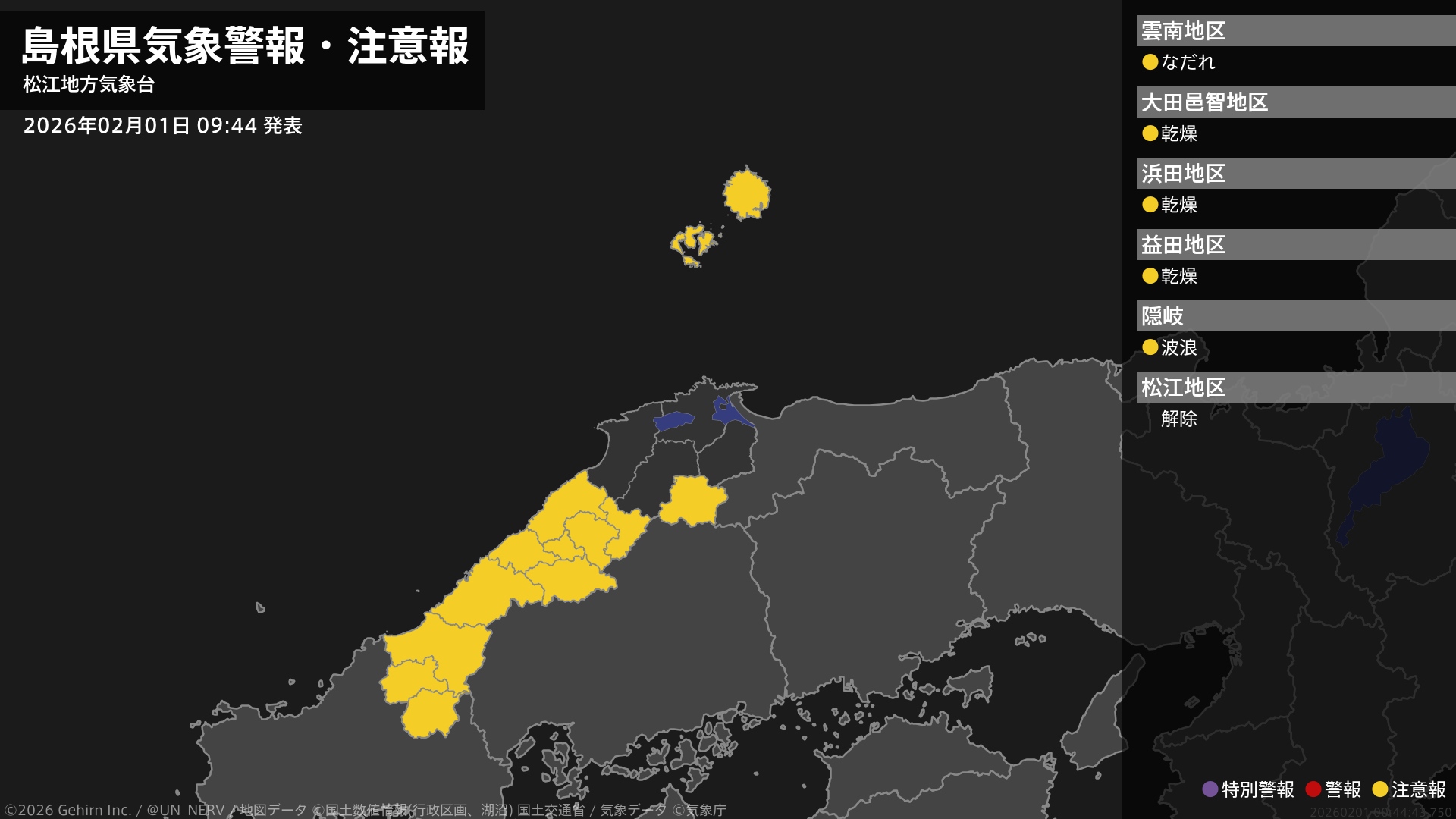 【島根県 気象警報・注意報 2026年02月01日 09:44】