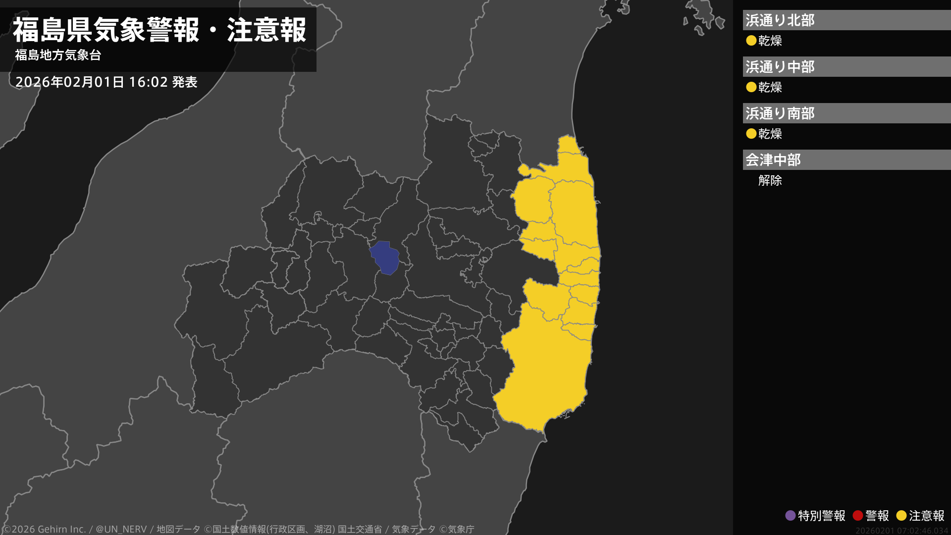 【福島県 気象警報・注意報 2026年02月01日 16:02】浜通りでは、ここしばらく空気の乾燥した状態が続くため、火の取り扱いに注意してください。#気象警報注意報 #福島県