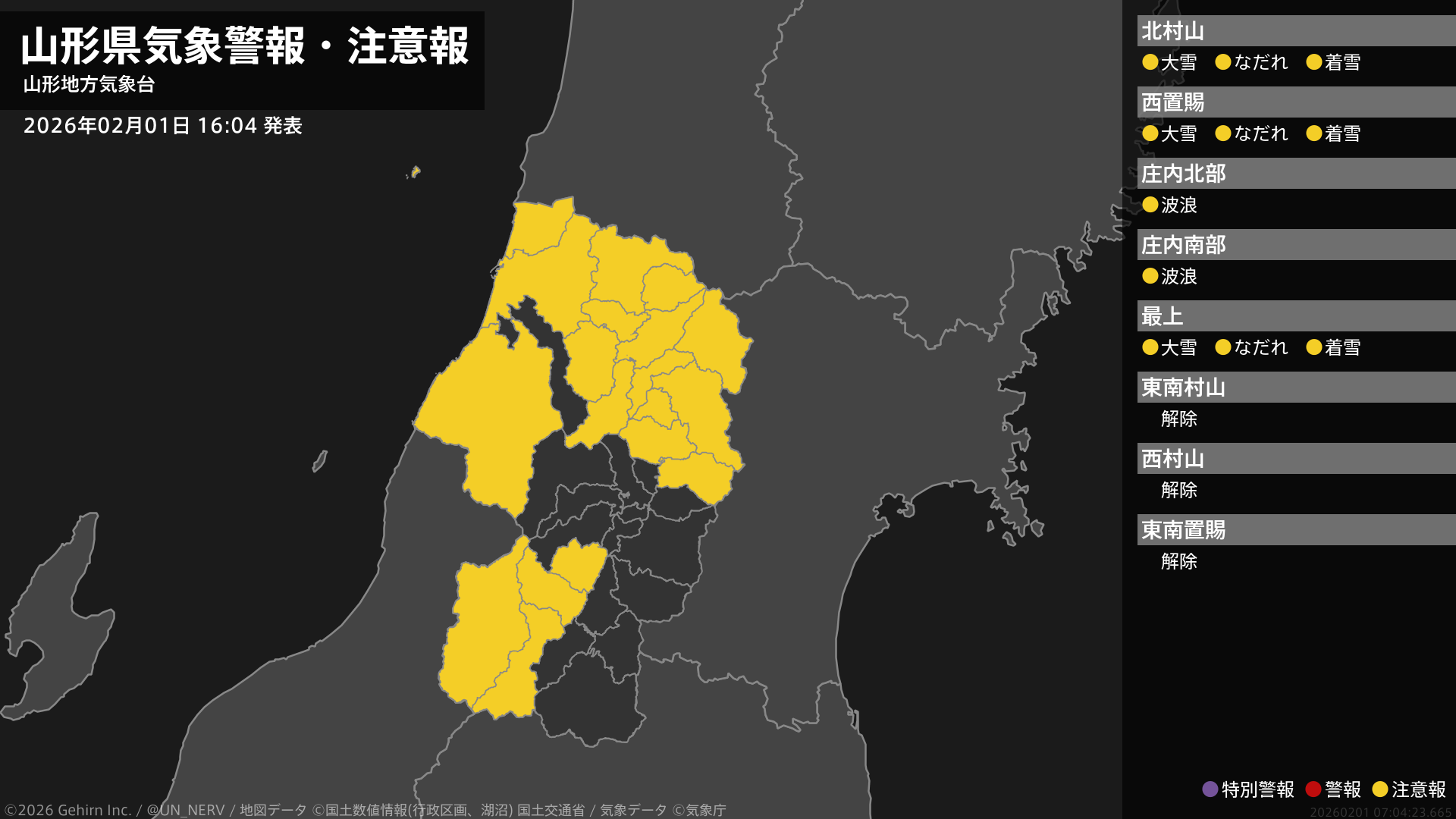 【山形県 気象警報・注意報 2026年02月01日 16:04】村山、置賜、最上では、2日明け方まで大雪や電線等への着雪に、2日までなだれに注意してください。庄内では、2日明け方まで高波に注意してください。#気象警報注意報 #山形県