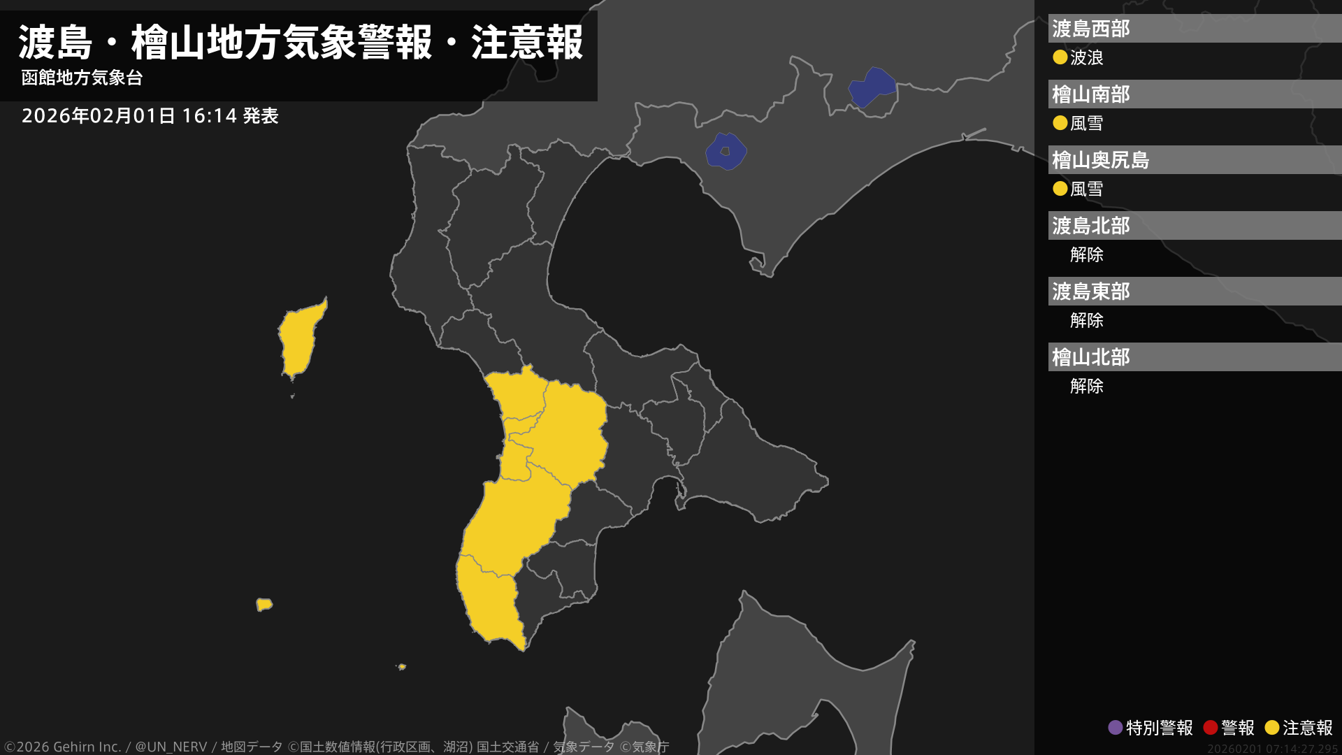 【渡島・檜山地方 気象警報・注意報 2026年02月01日 16:14】檜山地方では、1日夜遅くまで風雪に注意してください。渡島地方では、1日夜遅くまで高波に注意してください。#気象警報注意報 #渡島地方 #檜山地方