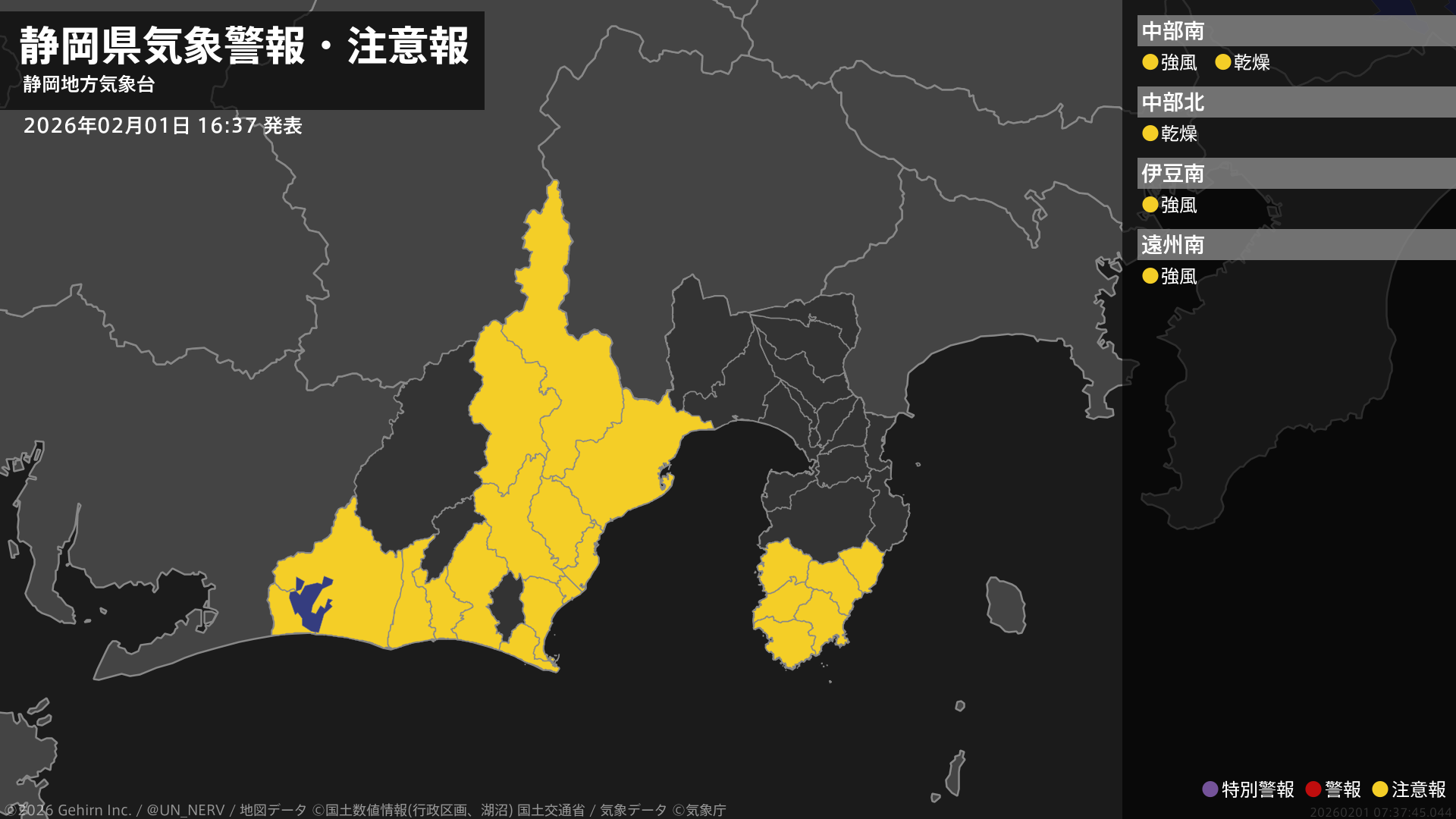 【静岡県 気象警報・注意報 2026年02月01日 16:37】中部、西部では1日夜遅くまで、伊豆では2日夕方まで、強風に注意してください。中部では、3日まで空気の乾燥した状態が続くため、火の取り扱いに注意してください。#気象警報注意報 #静岡県