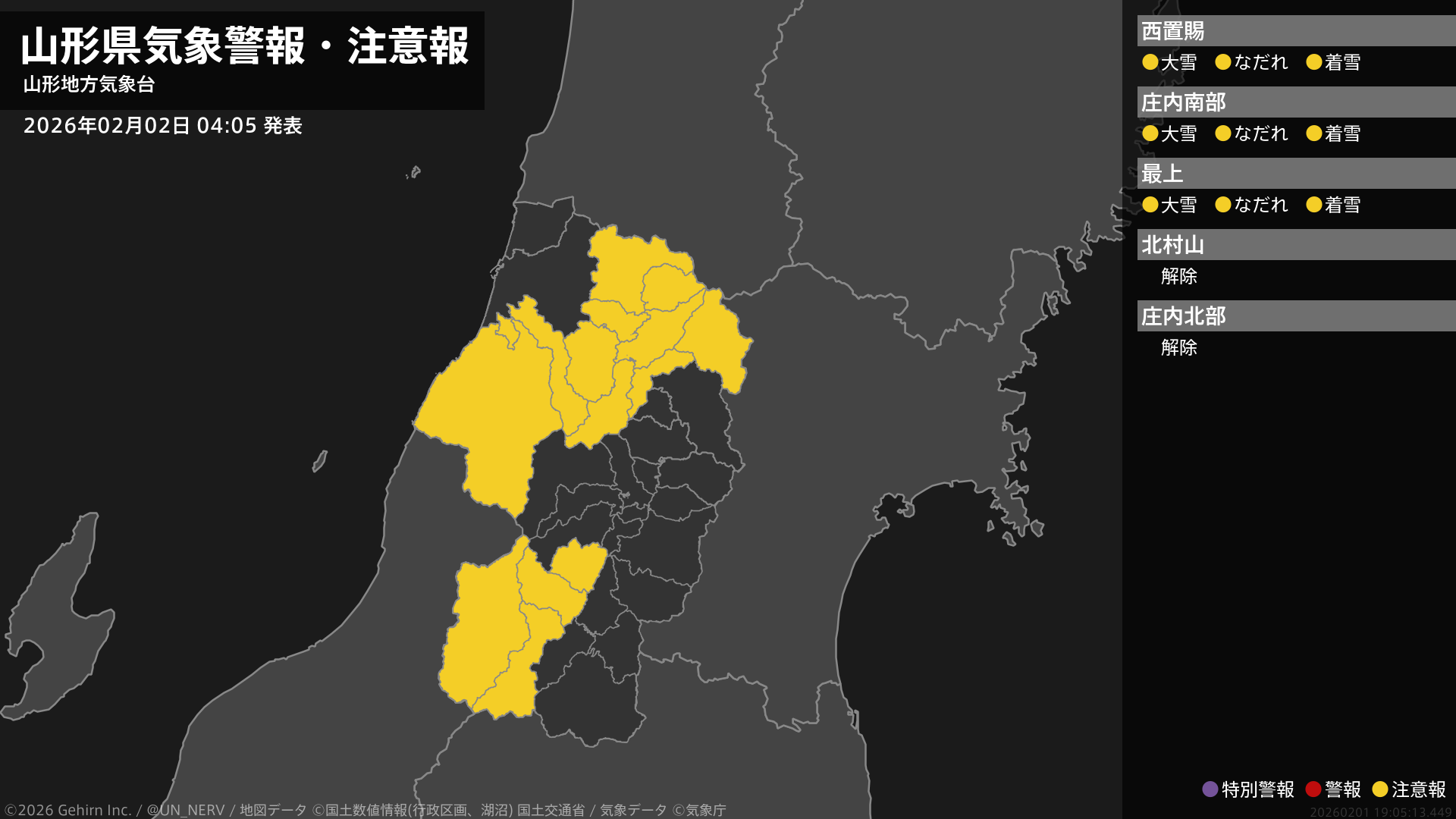 【山形県 気象警報・注意報 2026年02月02日 04:05】置賜、庄内、最上では、2日昼前まで大雪や電線等への着雪に、2日までなだれに注意してください。#気象警報注意報 #山形県