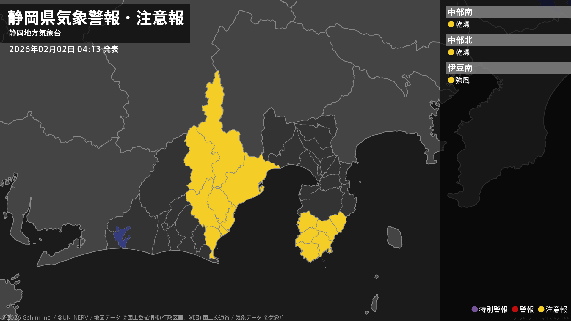 【静岡県 気象警報・注意報 2026年02月02日 04:13】伊豆では、2日夜のはじめ頃まで強風に注意してください。中部では、4日まで空気の乾燥した状態が続くため、火の取り扱いに注意してください。#気象警報注意報 #静岡県
