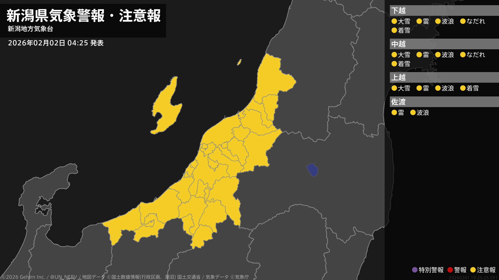 【新潟県 気象警報・注意報 2026年02月02日 04:25】下越、中越、上越では、大雪や電線等への着雪に注意してください。新潟県では、高波や竜巻などの激しい突風、落雷に注意してください。下越、中越では、なだれに注意してください。#気象警報注意報 #新潟県