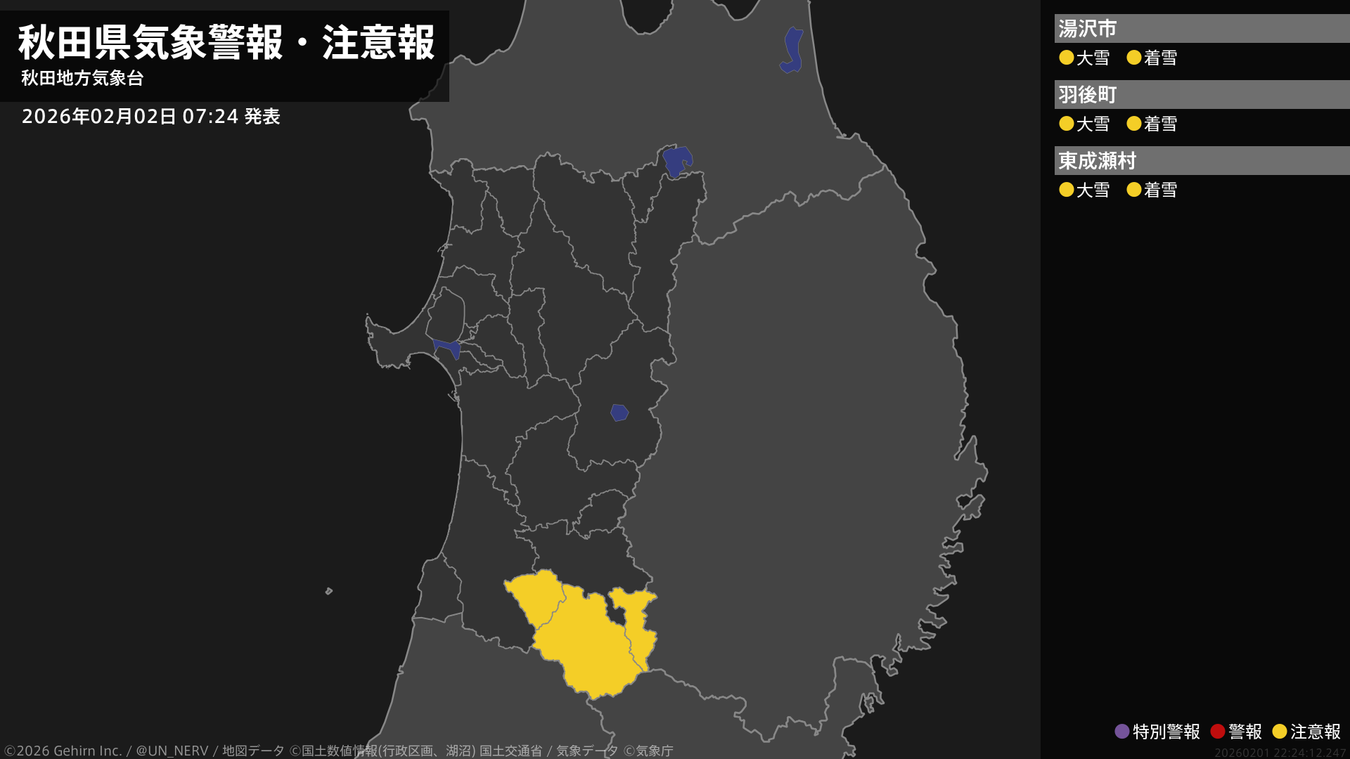 【秋田県 気象警報・注意報 2026年02月02日 07:24】内陸では、2日昼前まで大雪や電線等への着雪に注意してください。#気象警報注意報 #秋田県