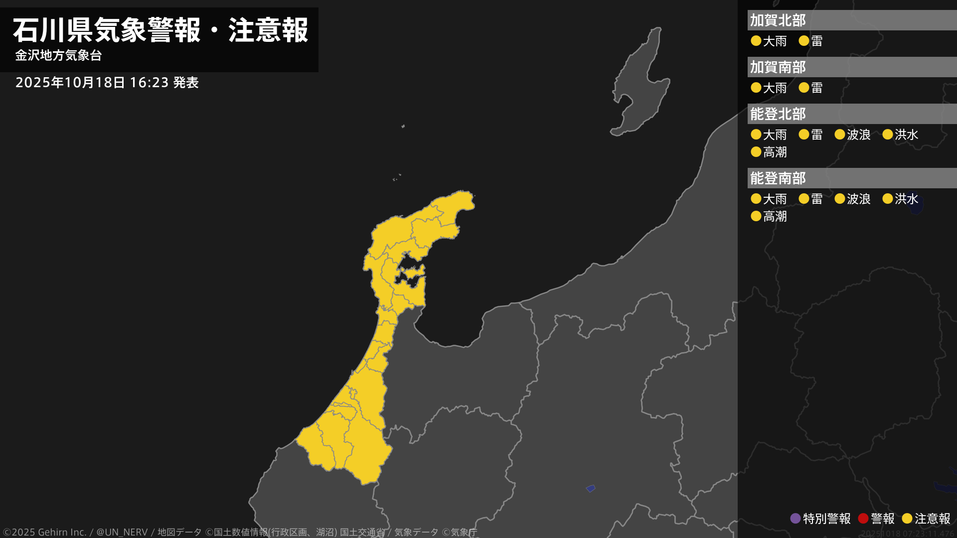 【石川県 気象警報・注意報 2025年10月18日 16:23】石川県では、低い土地の浸水や竜巻などの激しい突風、落雷に注意してください。能登では、河川の増水や高波、高潮に注意してください。#気象警報注意報 #石川県