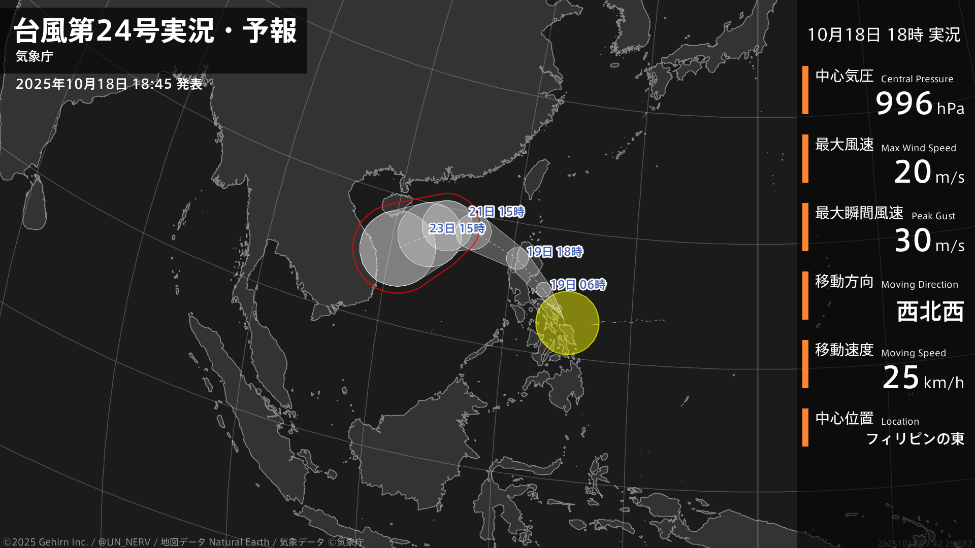 【台風第24号実況・予報 2025年10月18日 18:42】台風第24号(フンシェン)は、フィリピンの東を1時間に25キロの速さで西北西に進んでいます。#台風情報