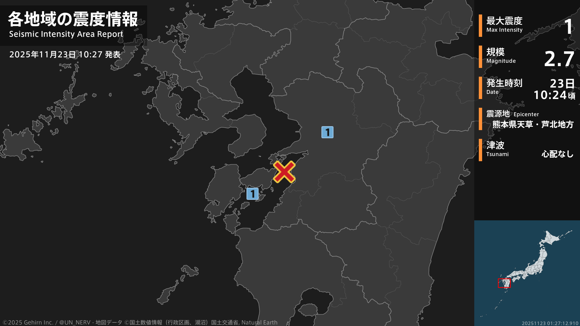 10時24分頃、熊本県天草・芦北地方を震源とする地震がありました。震源の深さは約10km、地震の規模はM2.7、最大震度1を熊本県で観測しています。この地震による津波の心配はありません。