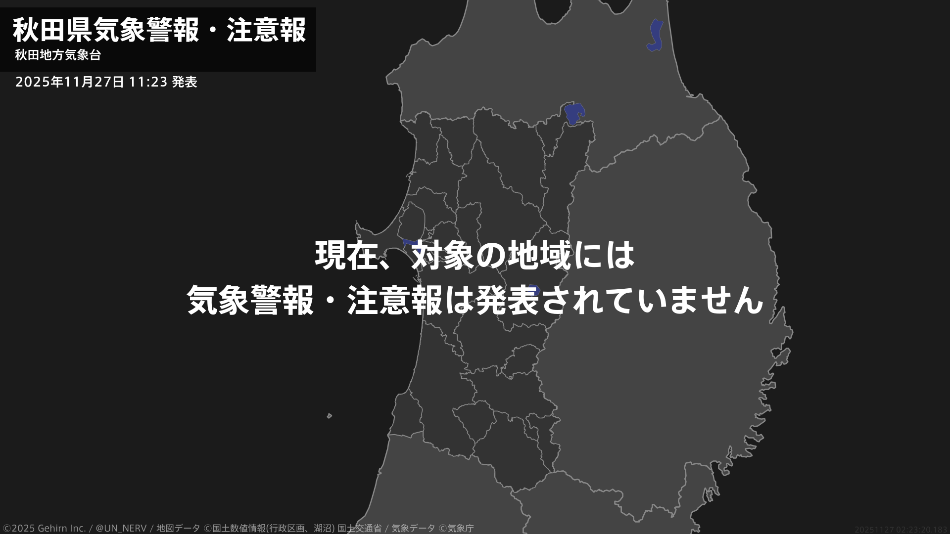 【秋田県 気象警報・注意報 2025年11月27日 11:23】注意報を解除します。#気象警報注意報 #秋田県
