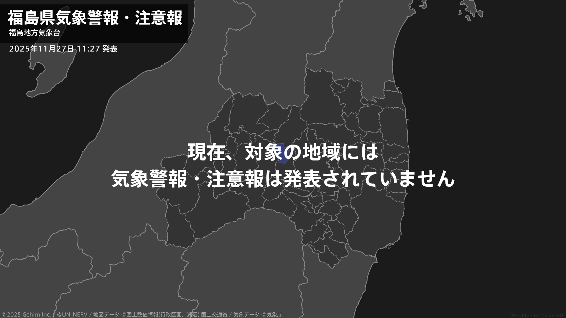 【福島県 気象警報・注意報 2025年11月27日 11:27】注意報を解除します。#気象警報注意報 #福島県