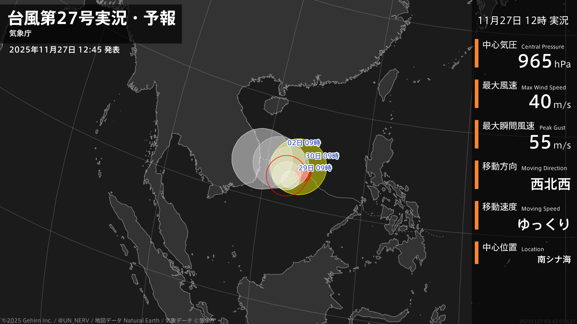 【台風第27号実況・予報 2025年11月27日 12:42】強い台風第27号(コト)は、南シナ海をゆっくりと西北西に進んでいます。#台風情報