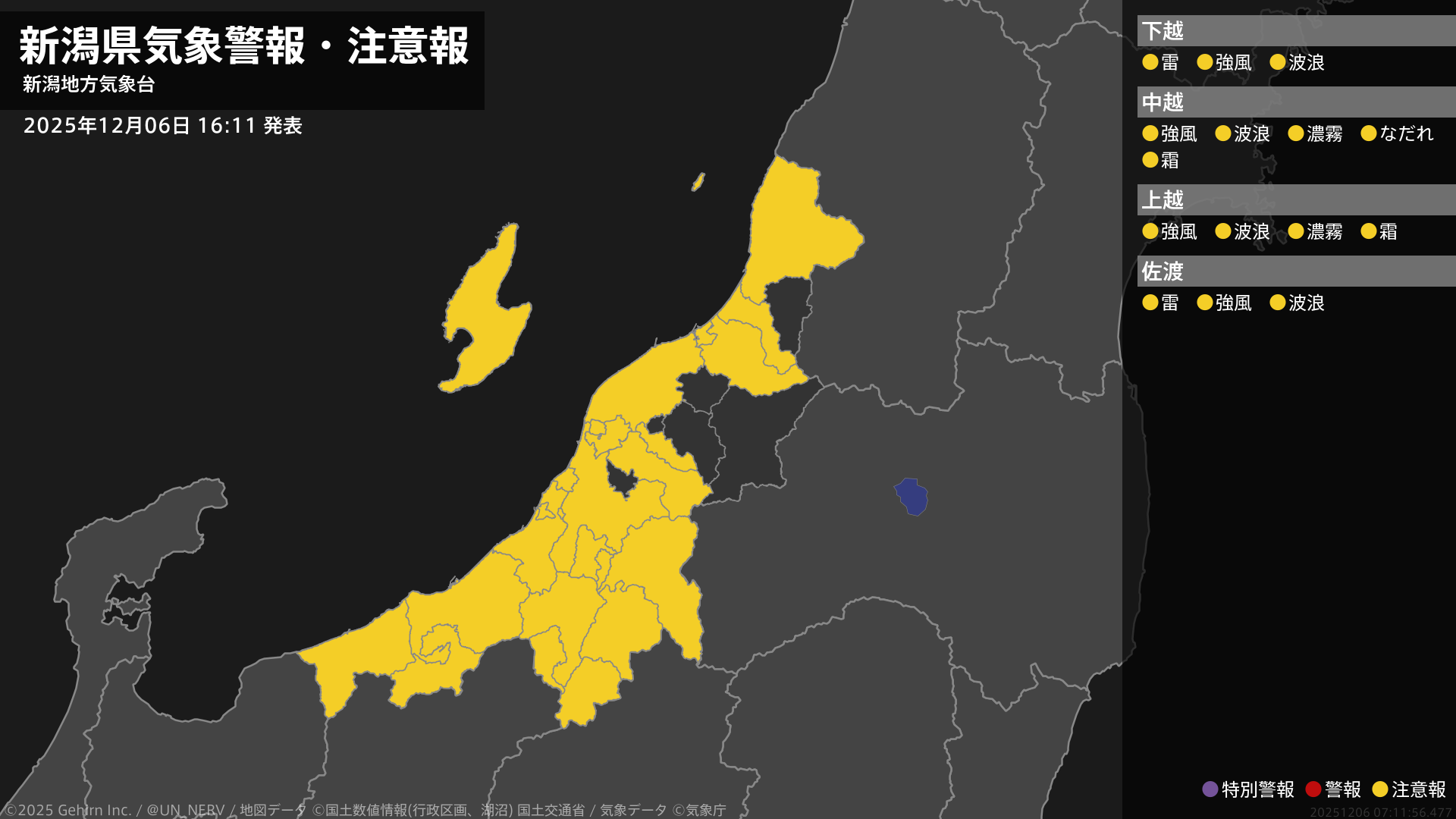 【新潟県 気象警報・注意報 2025年12月06日 18:07】新潟県では強風や高波に、下越、佐渡では落雷に、下越、中越、上越では濃霧による視程障害に、中越ではなだれに、中越、上越では霜に対する農作物の管理に注意してください。#気象警報注意報 #新潟県