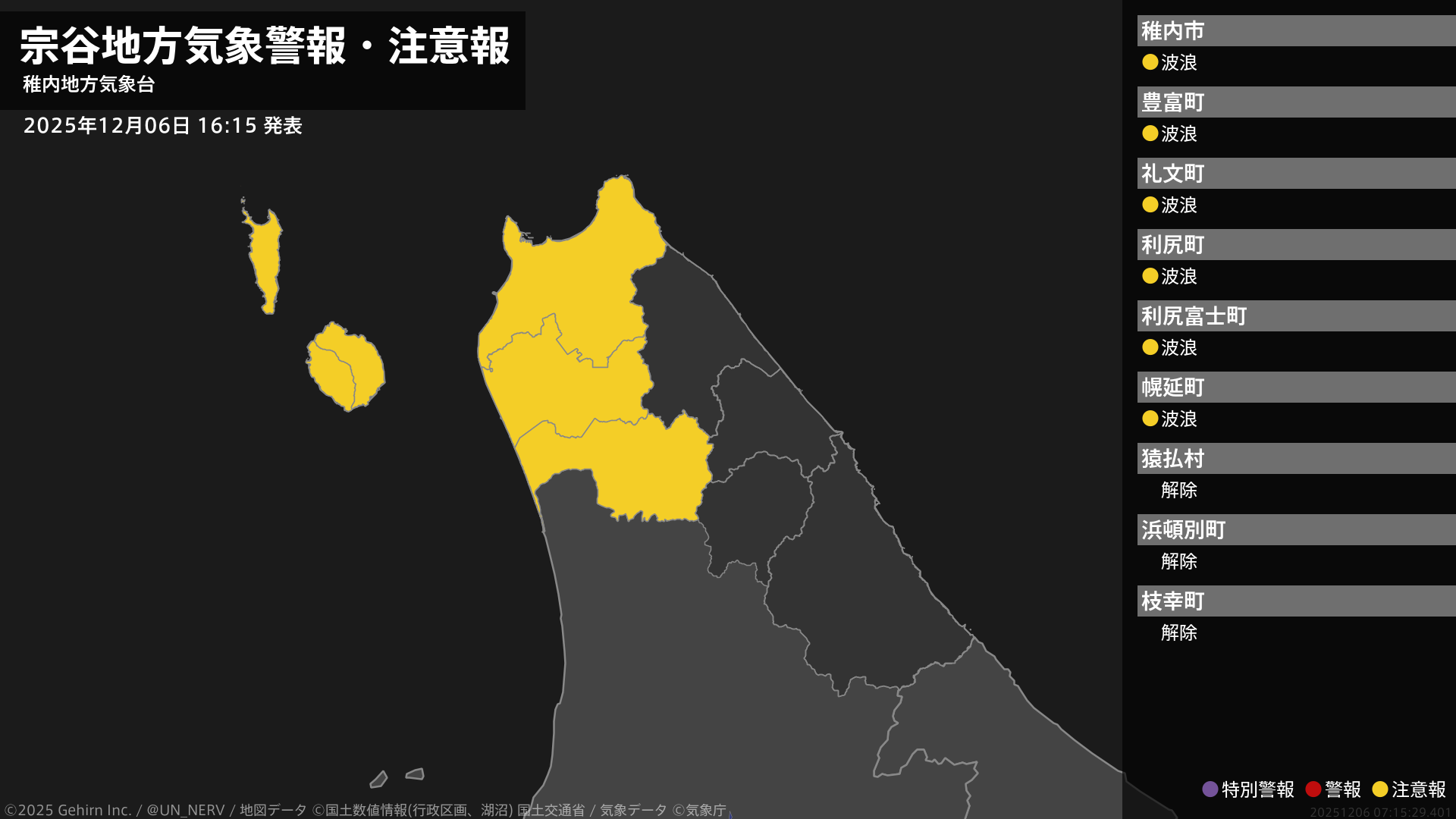 【宗谷地方 気象警報・注意報 2025年12月06日 16:15】宗谷地方では、7日明け方まで高波に注意してください。#気象警報注意報 #宗谷地方