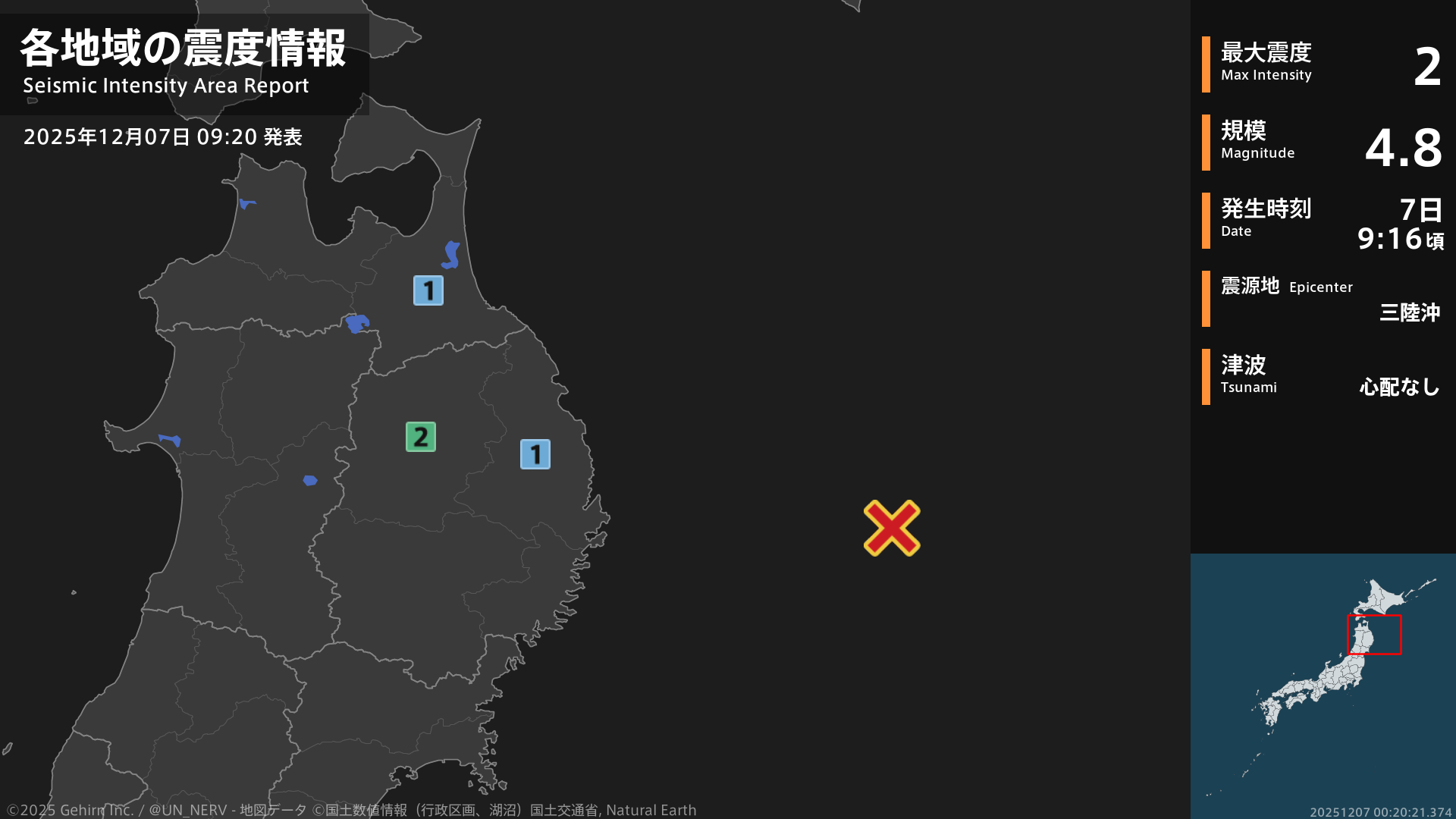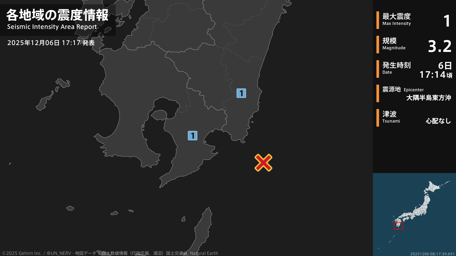 【地震情報 2025年12月6日】17時14分頃、大隅半島東方沖を震源とする地震がありました。震源の深さは約40km、地震の規模はM3.2、最大震度1を宮崎県、鹿児島県で観測しています。この地震による津波の心配はありません。#地震 #宮崎県 #鹿児島県
