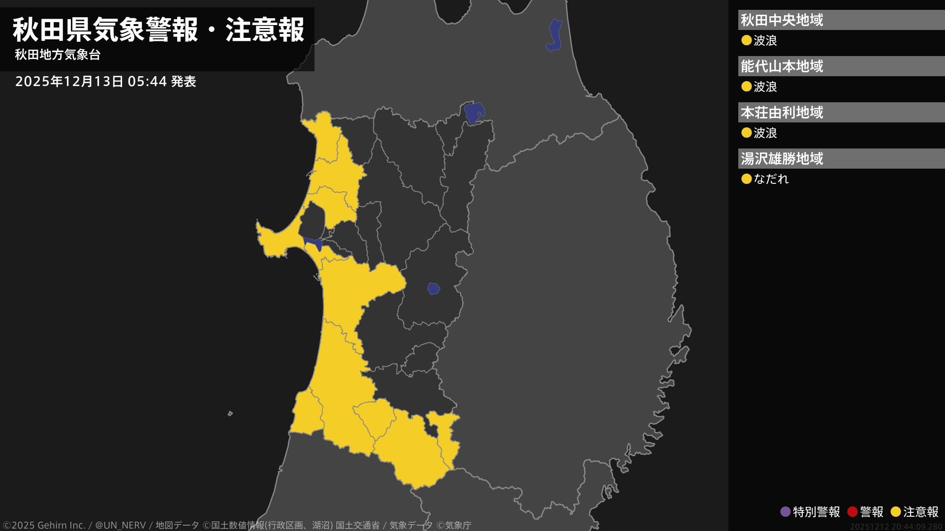 【渡島・檜山地方 気象警報・注意報 2025年12月14日 10:44】渡島、檜山地方では、強風や高波、急な強い雨、落雷、電線等への着雪に注意してください。#気象警報注意報 #渡島地方 #檜山地方