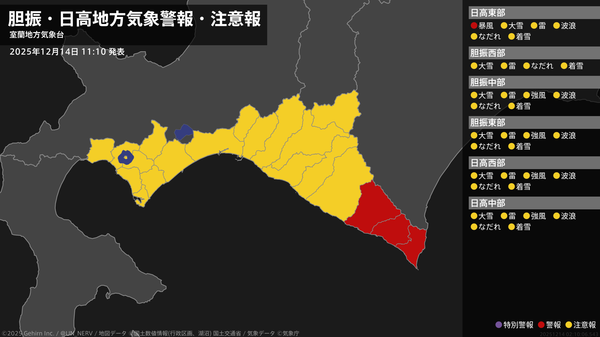 【胆振・日高地方 気象警報・注意報 2025年12月14日 11:10】日高地方では、14日夕方から14日夜のはじめ頃まで暴風に警戒してください。#気象警報注意報 #胆振地方 #日高地方
