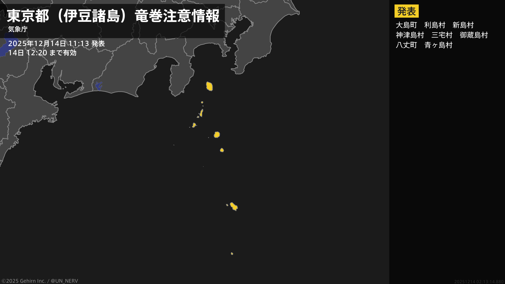 【東京都 気象警報・注意報 2025年12月14日 11:57】伊豆諸島北部、伊豆諸島南部、小笠原諸島では、強風や高波に注意してください。伊豆諸島南部、小笠原諸島では、竜巻などの激しい突風や急な強い雨、落雷に注意してください。#気象警報注意報 #東京都