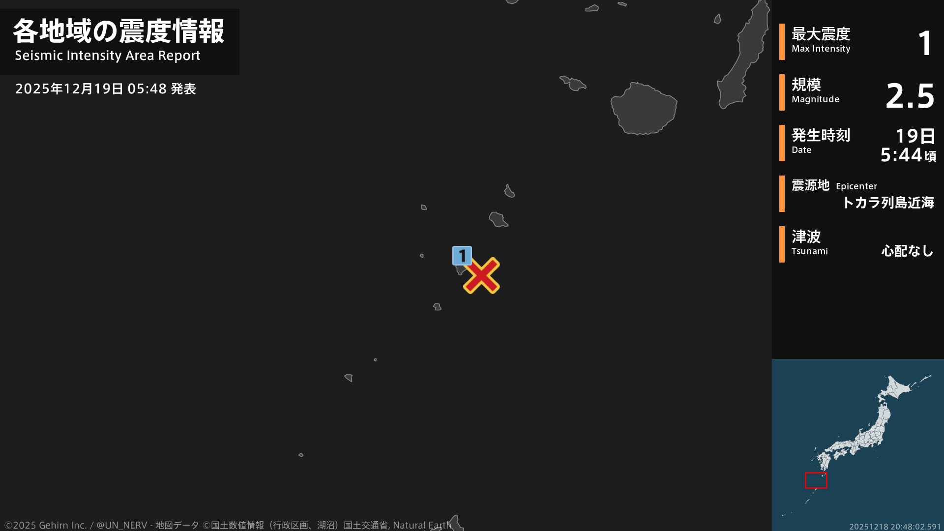 5時44分頃、トカラ列島近海を震源とする地震がありました。震源の深さはごく浅い、地震の規模はM2.5、最大震度1を鹿児島県で観測しています。この地震による津波の心配はありません。