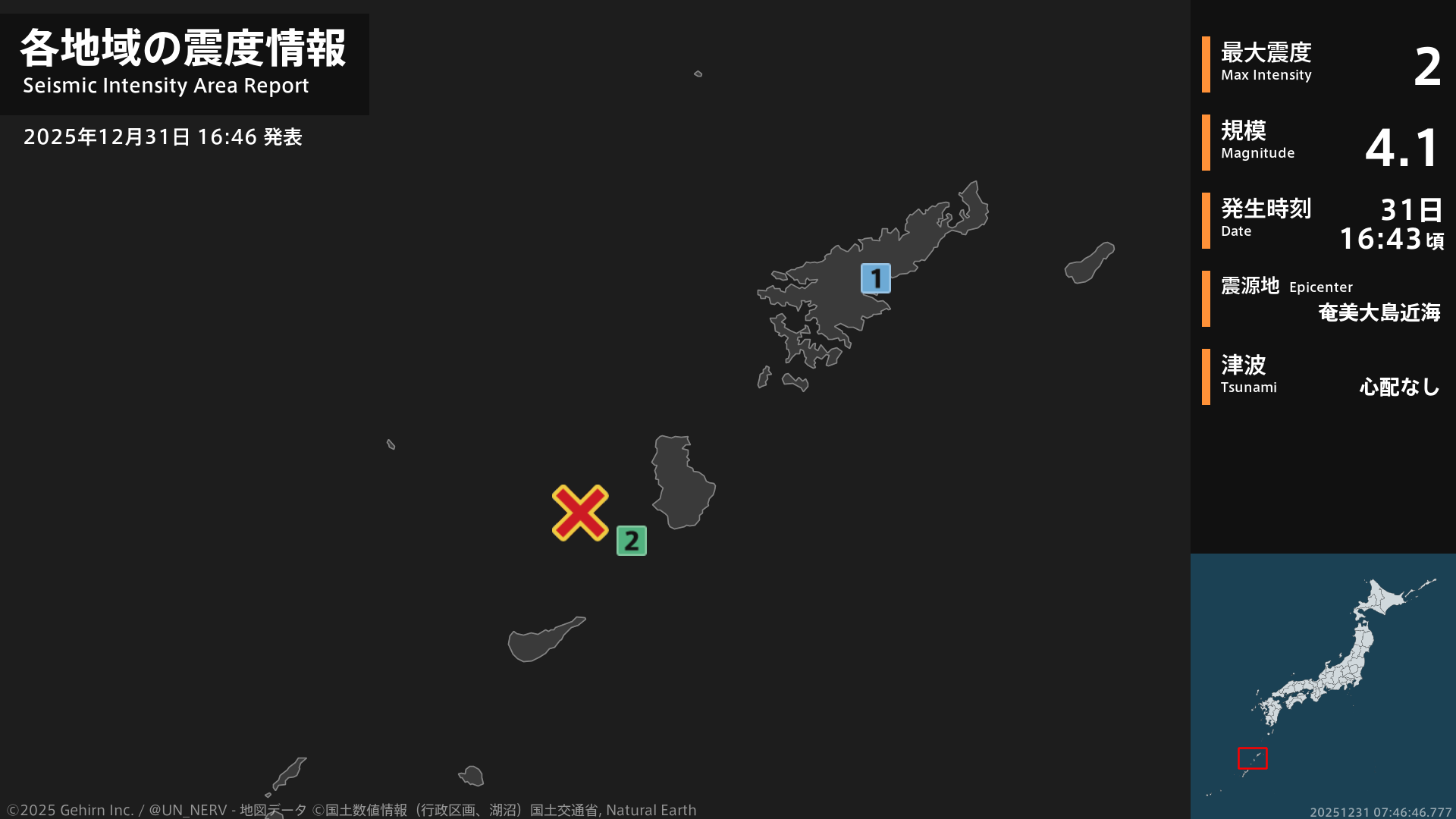 16時43分頃、奄美大島近海を震源とする地震がありました。地震の規模はM4.3程度、最大震度3程度と推定されています。この情報は気象庁の予報に基づく推定です。情報は誤差を含む場合があります。