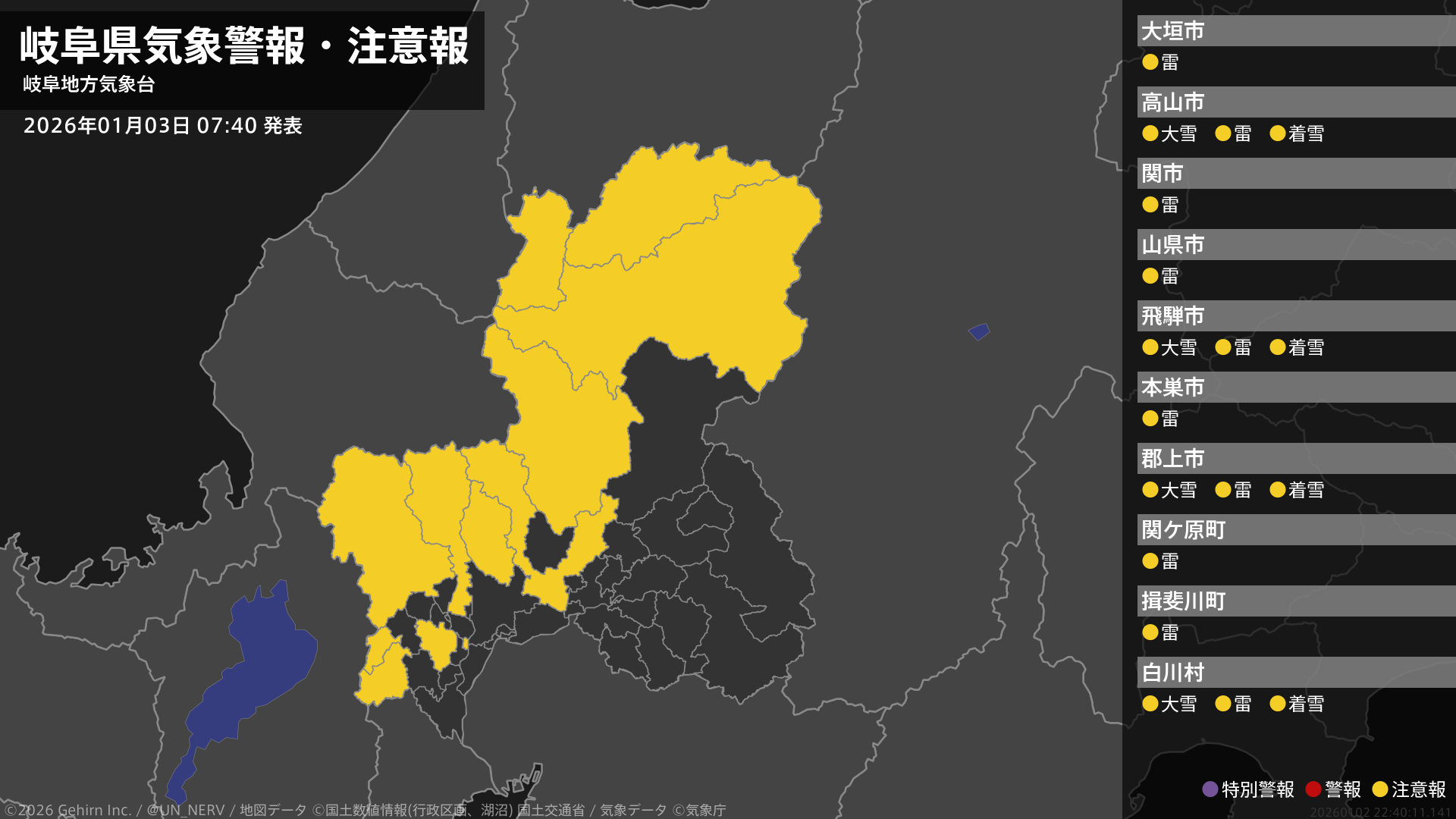 【岐阜県 気象警報・注意報 2026年01月03日 07:40】岐阜県では、3日昼前まで大雪や電線等への着雪に、3日夕方まで落雷に注意してください。#気象警報注意報 #岐阜県